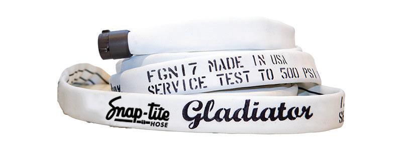 Gladiator™ FGN is one of the leading attack lines in the industry. Built to last, this rugged hose is constructed with extruded thru-the-weave nitrile rubber liner with a durable outer polyester jacket, providing incredible strength and long-lasting performance. The Gladiator™ FGN performs well at high or low pressures and has a smooth 1.77” waterway for less kinking than other products on the market. Both the nitrile rubber thru-the-weave inner lining and outer jacket are proudly made at our factories in Pennsylvania, USA.