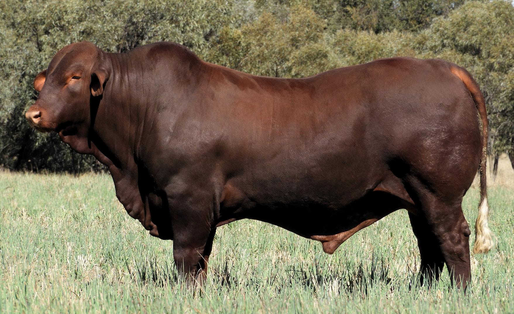 is the complete package! He oozes sire appeal, with his broad poll head, strong bone, loose cherry red coat and tremendous capacity. Raider (P) won Grand Champion Santa Gertrudis Bull at BEEF 2024 where he was touted as a game changing bull for his red meat combined with softness & even fat coverage. He is a mobile bull with faultless structure and large testicles which saw him secure the Interbreed Grand Champion Bull Title at Wandoan Show earlier this year. A standout since a calf, Raider (P) was exhibited at the Brangus Youth Camp as a yearling, by our 6-year-old nephew, testament to his impeccable temperament. Dam, Murgona Limeric has had 3 calves in 3 years, the latest of which is an admirable heifer, and is PTIC again.