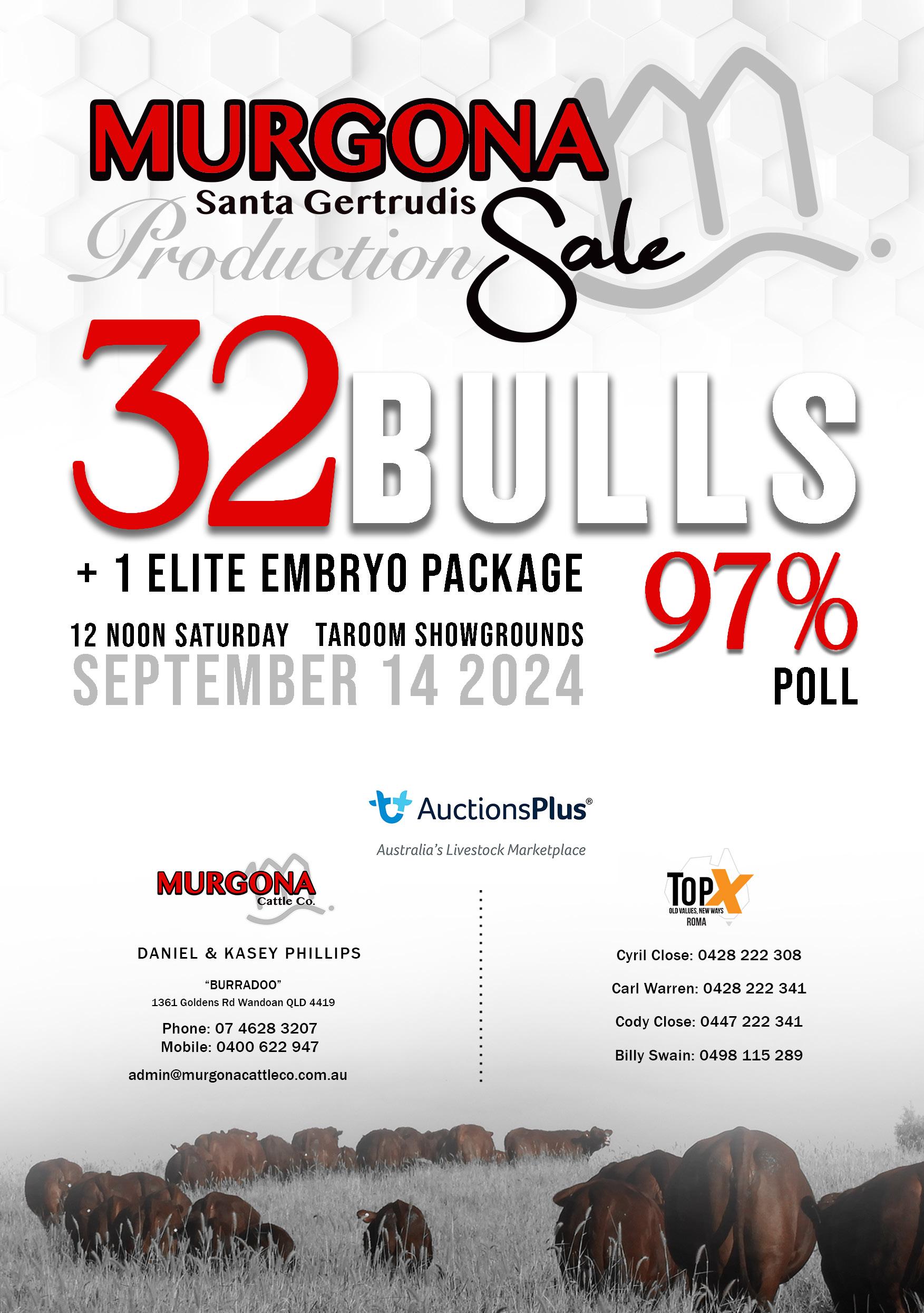 We are excited to invite you to the third annual Murgona Santa Gertrudis Sale at the Taroom Showgrounds. Please note the change of day & date for this year’s sale! After obtaining client feedback we trust that this change will be advantageous to most. If you aren’t able to attend in person on Saturday the 14th of September, AuctionsPlus will be livestreaming the sale with full video, audio and bidding capabilities. Sale Bulls will also be available for inspection at our Open Day on Friday the 30th of August. This event will afford you the opportunity to inspect the sale team, plus a selection of our greater herd, in a relaxed environment. If, however, you require a private inspection on a more suitable date, please don’t hesitate to ask. We will do our utmost to accommodate you as we enjoy nothing better than sharing our herd, and discussing breeding objectives, with like-minded producers.