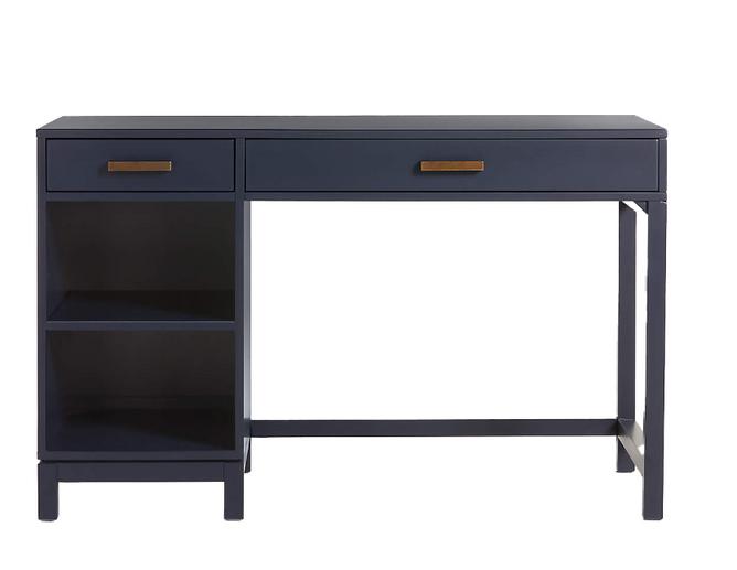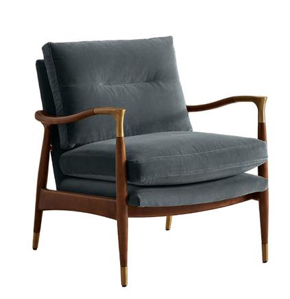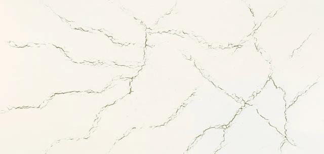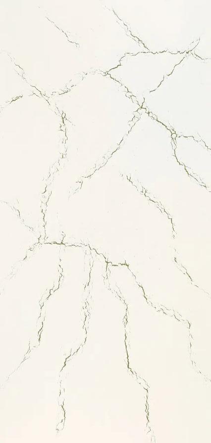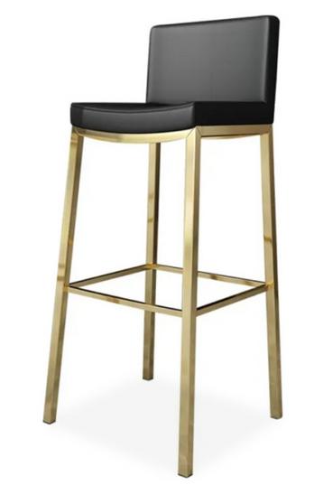 Waterfall island countertop in the beautiful Cambria countertop with brass veining to bring out the brass fixtures. Modern Black Faux Leather Bar Height