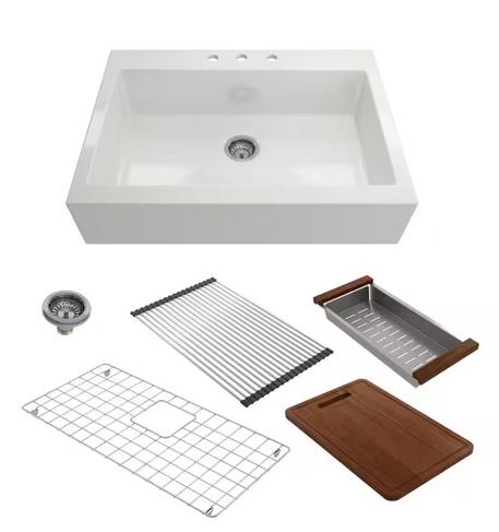 Nuova White Fireclay 34 in. Single Bowl Drop-In Apron Front Kitchen Sink with Protective Grid, Strainer, & Cutting Board