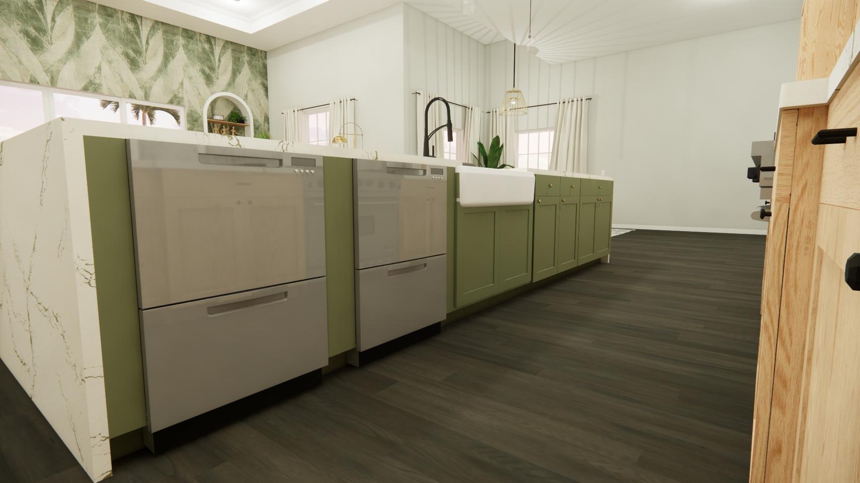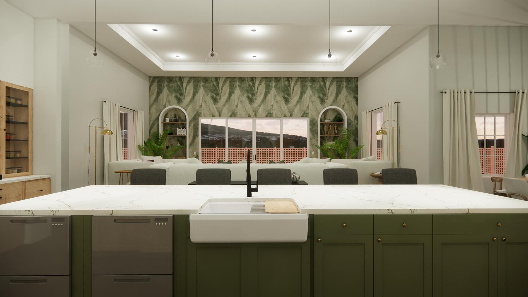 A large apron front sink was added with removable cutting and dish drying rack. The island cabinets were painted a gorgeous sage green to pull in the color from the wallcovering in the living room.