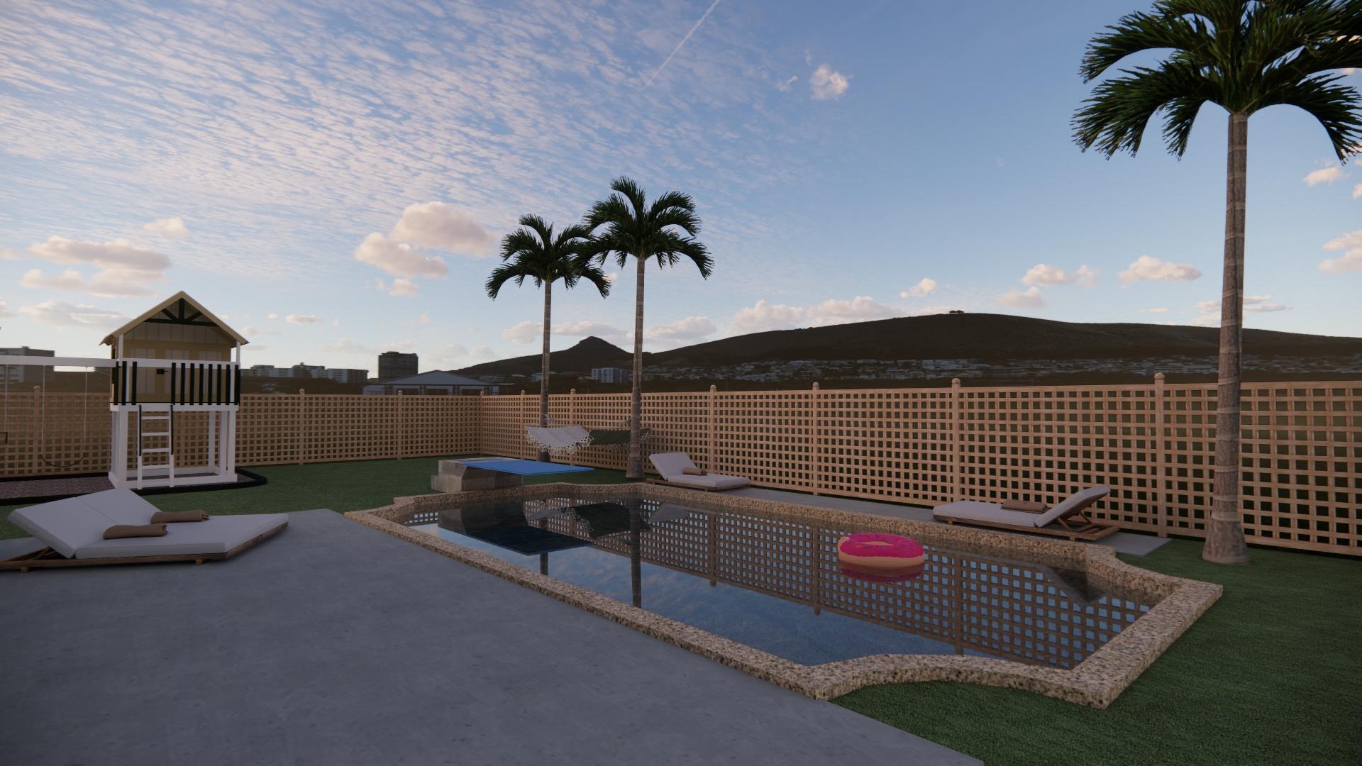A large sliding glass door in the living room leads straight out to the backyard, pool, and playground.
