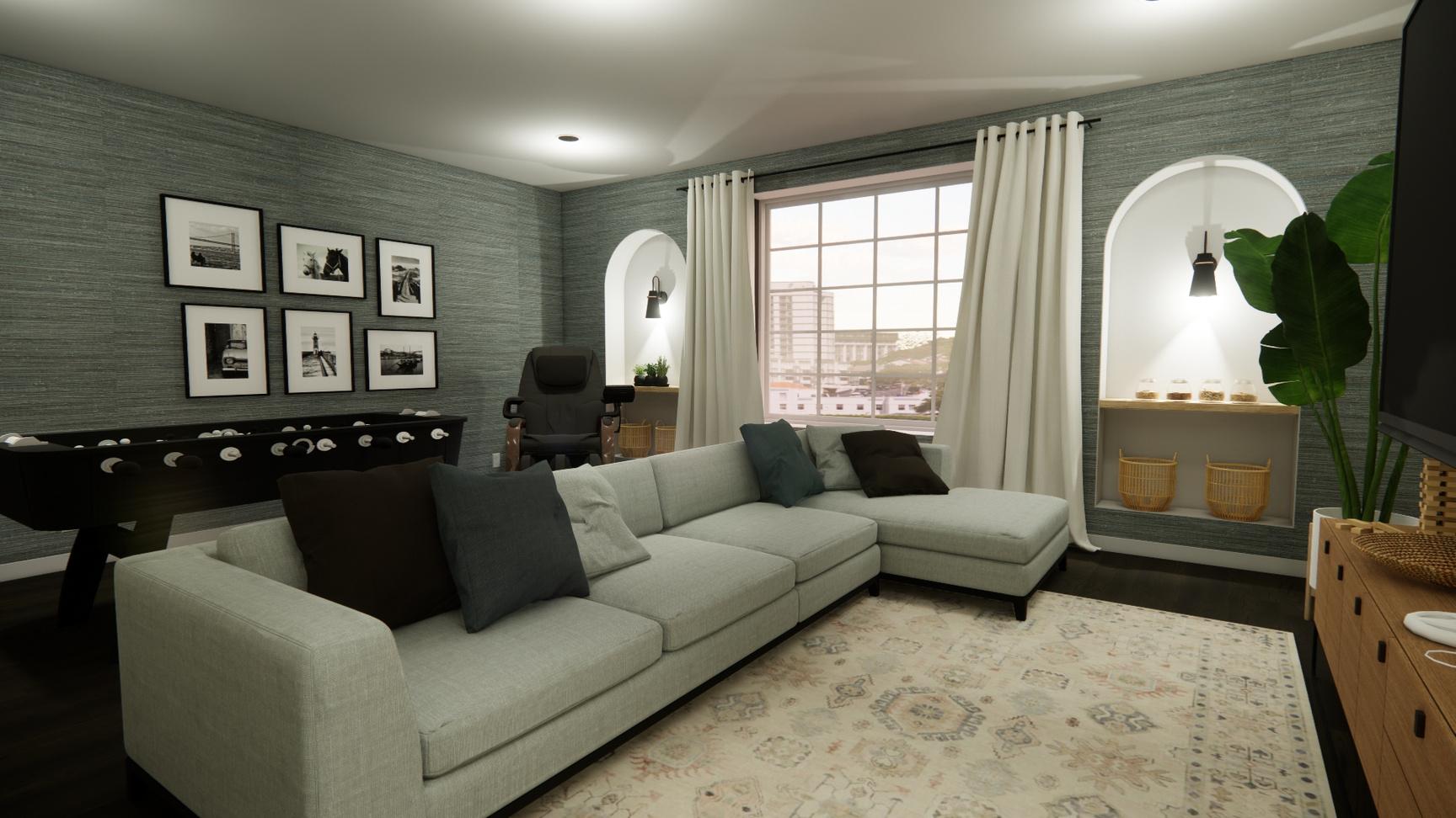 A large couch and two very large love seats were chosen for this space because the family hosts many people at a time and wanted a space where they can all gather.
