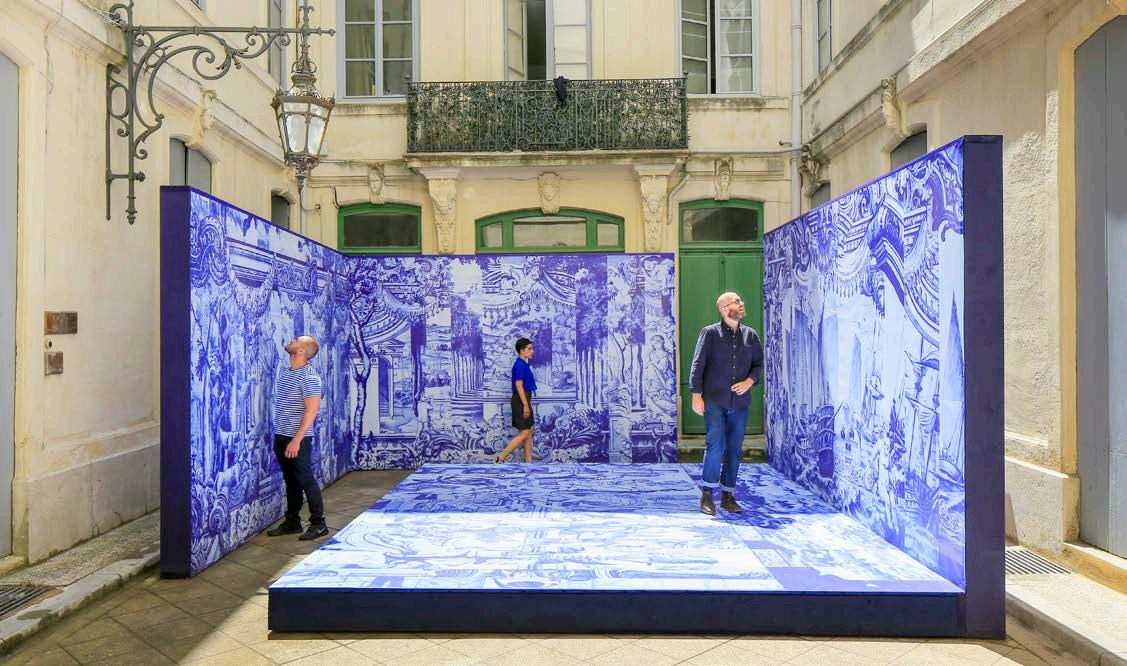 Entrer dans une cour montpelliéraine et se sentir immergé dans un paysage portugais est l'expérience spatiale que cette installation cherche à offrir. Le bleu des azulejos (carreaux de céramique traditionnels portugais) introduit une nouvelle tonalité dans la cour et porte la mémoire d'un autre lieu.