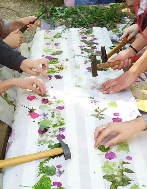 Commande directe - Installation artistique éphémère dans l'espace public Festival la Mostra d'Art Urbà de Espai d'Arts Roca Umbert - Granollers , Espagne - Mai 2021 Tatakizomé de végétaux sur tissus, structure bois et enregistrement sonore 5m de long, 1m de large, 3m de haut