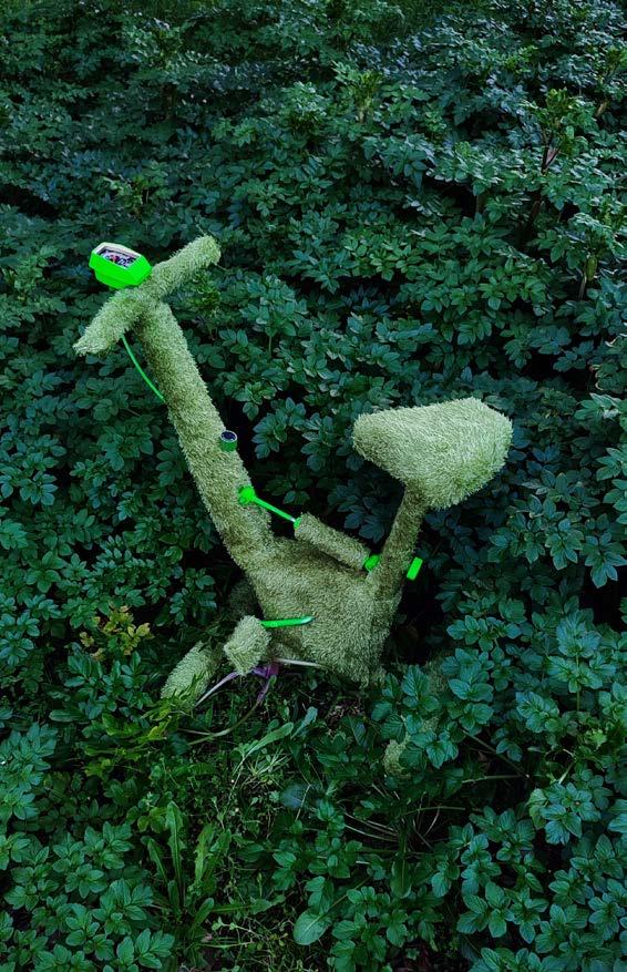 Perdue au milieu d'une forêt, Greenwashing est une installation composée de matériaux réutilisés. Principalement constituée de treillis métallique assemblé avec des roues de vélo, sur lesquelles sont fixés des tissus récupérés, cette pièce contraste fortement avec son environnement par sa forme et ses couleurs.