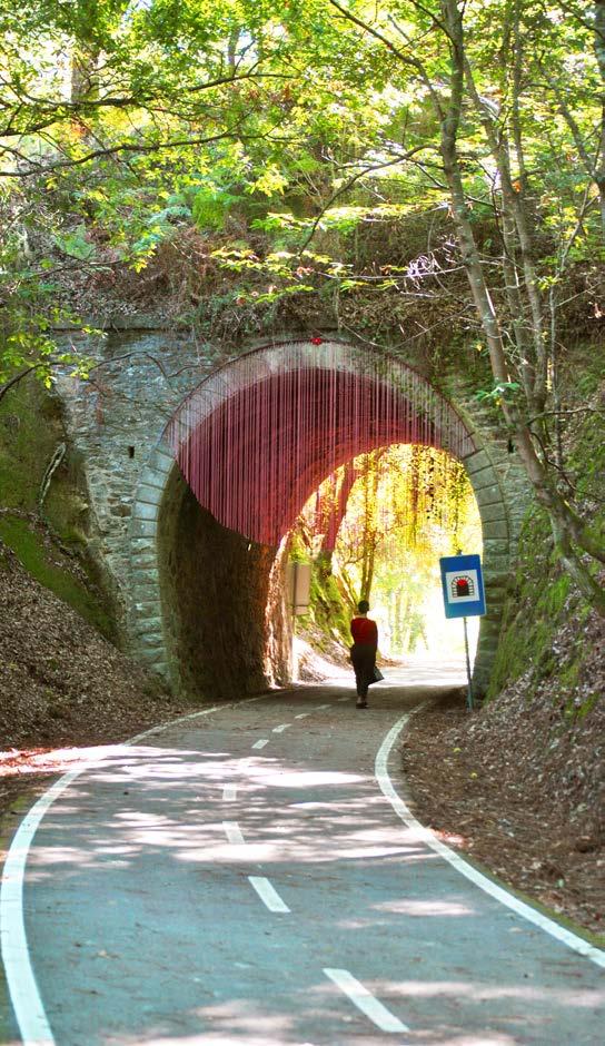 Ce cercle rouge peut évoquer un panneau ou un feu de signalisation pour les trains qui passaient autrefois. Cependant, si ces signaux sont restrictifs, la matérialité et la légèreté du cercle en forme de ruban invitent à entrer. Ainsi, les rubans, qui ressemblent à de la végétation tombant à l'entrée du tunnel, sont en réalité des rideaux que l'on trouve couramment sur les portes des maisons portugaises. Nous voulions également intégrer un élément quotidien dans la composition matérielle de l'œuvre, permettant à un objet ordinaire de prendre une dimension extraordinaire en dehors de son contexte habituel.