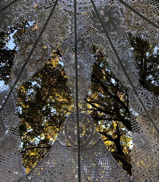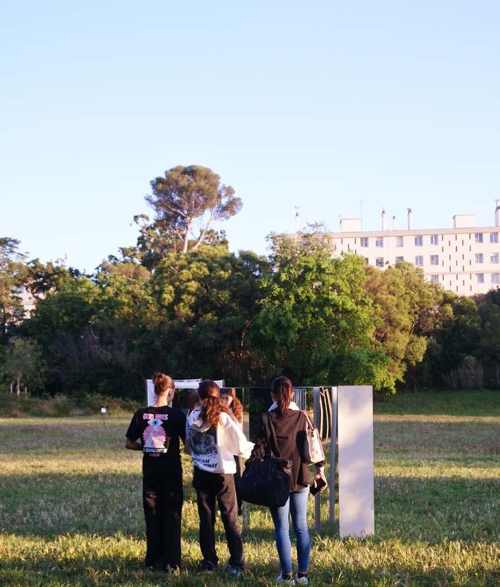 Projet Lauréat - Installation artistique éphémère dans l'espace public sur le thème de la beauté Festival des Architectures Vives de Montpellier, France - Juin 2019 Toile micro-perforée transparente imprimée et tendue sur une structure bois, grille en fil de laine