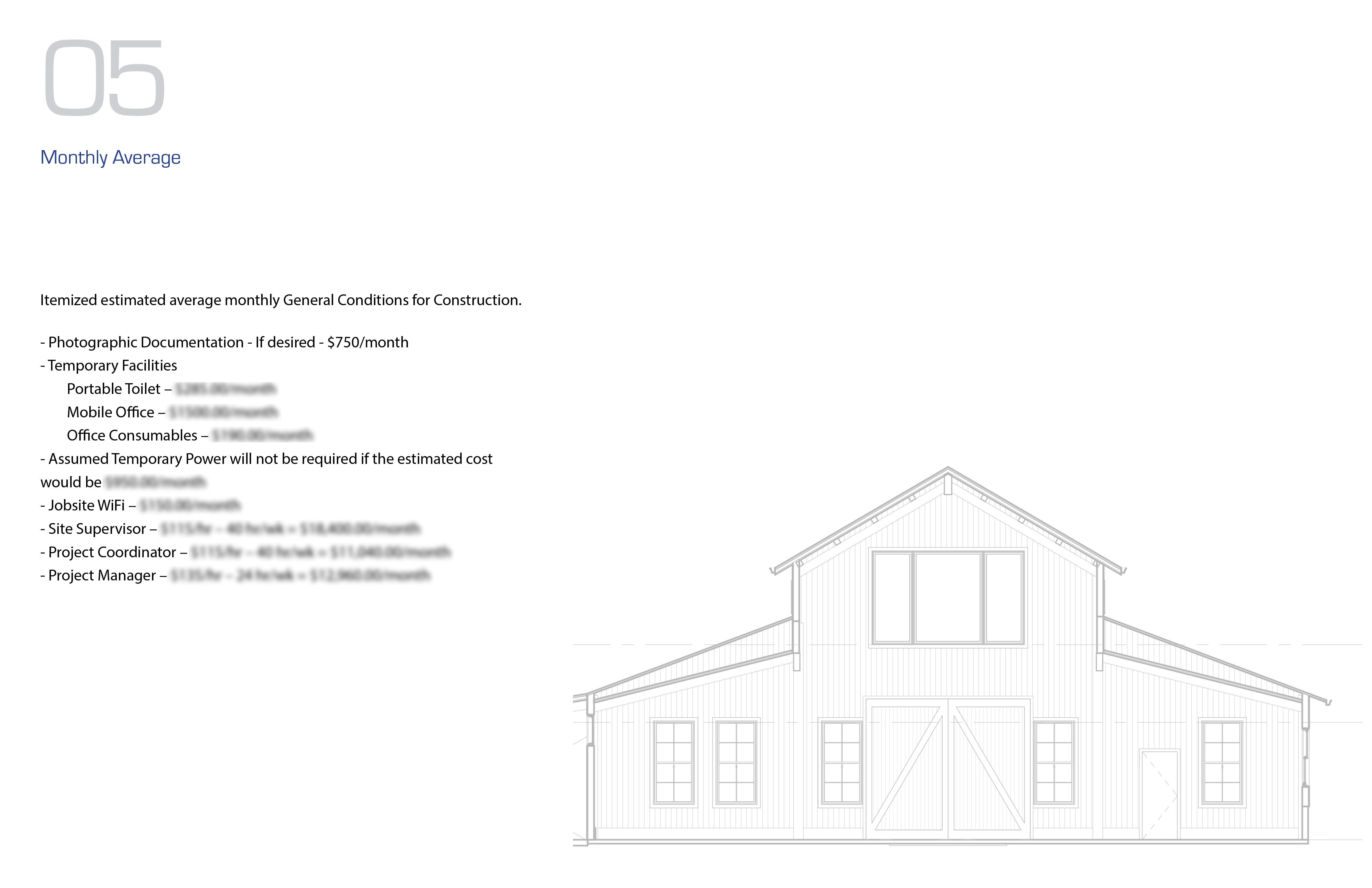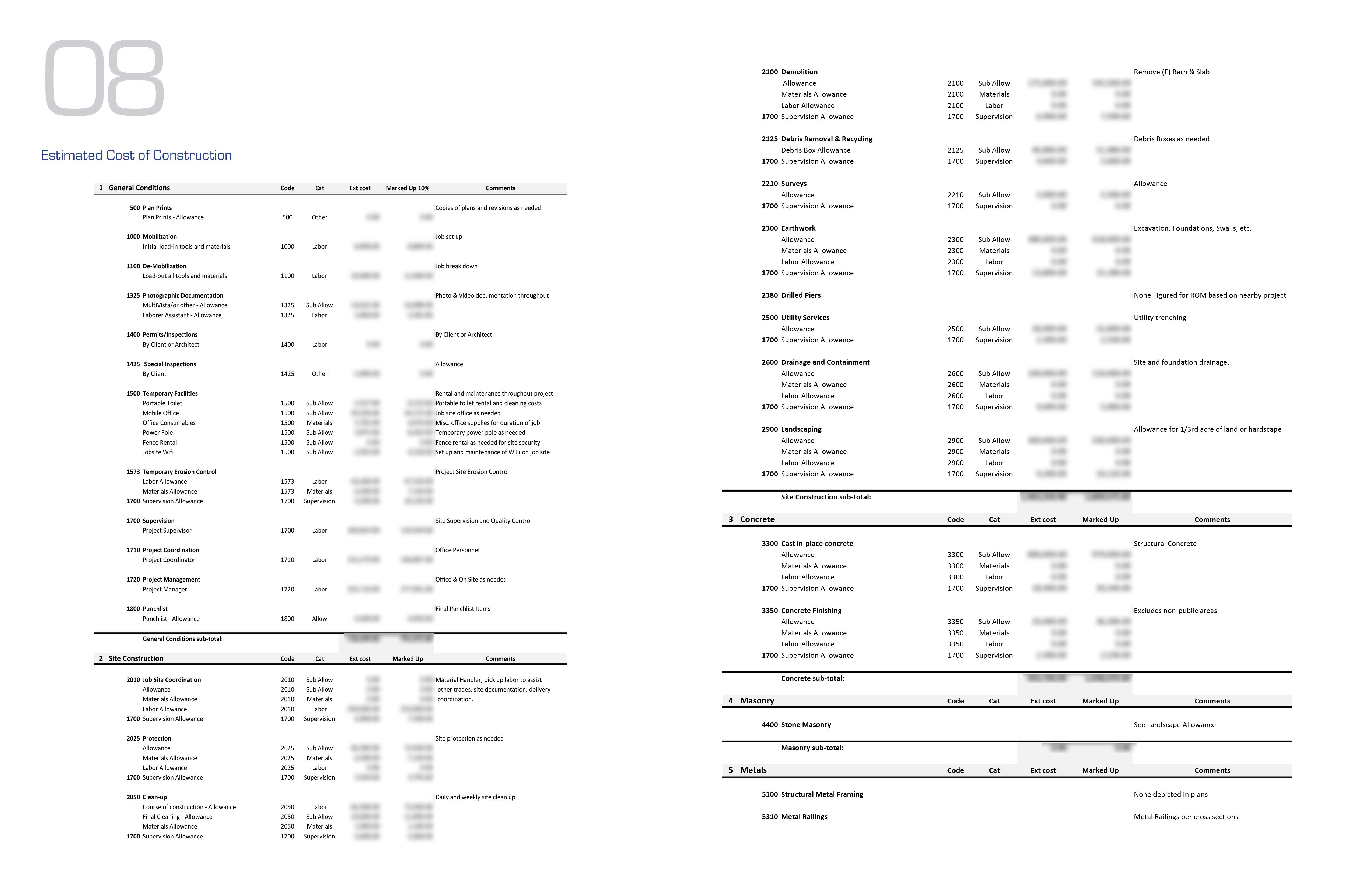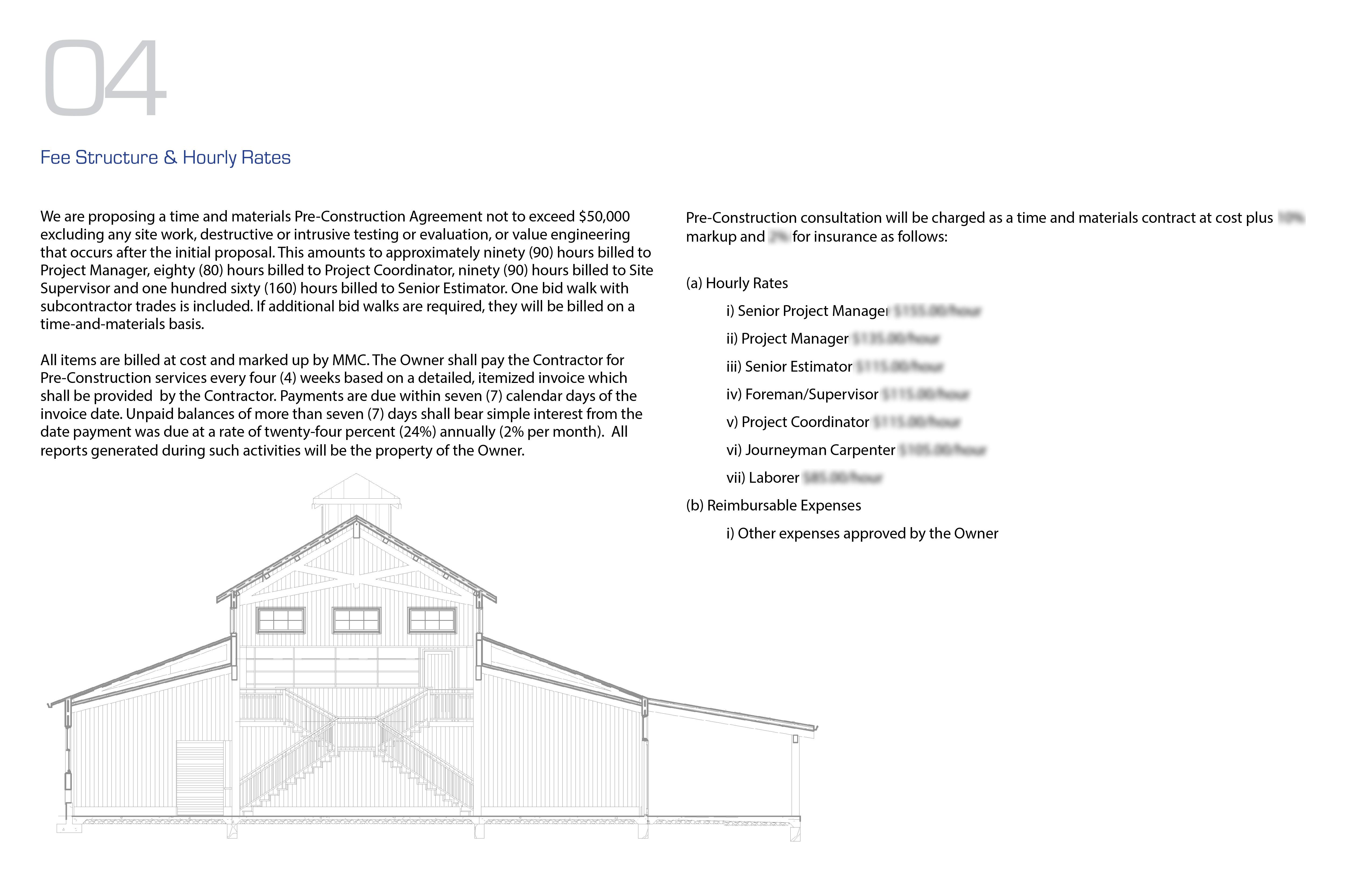 Estimate of fees for Pre-Construction Services. Hourly rates for both Pre-Construction and Construction.