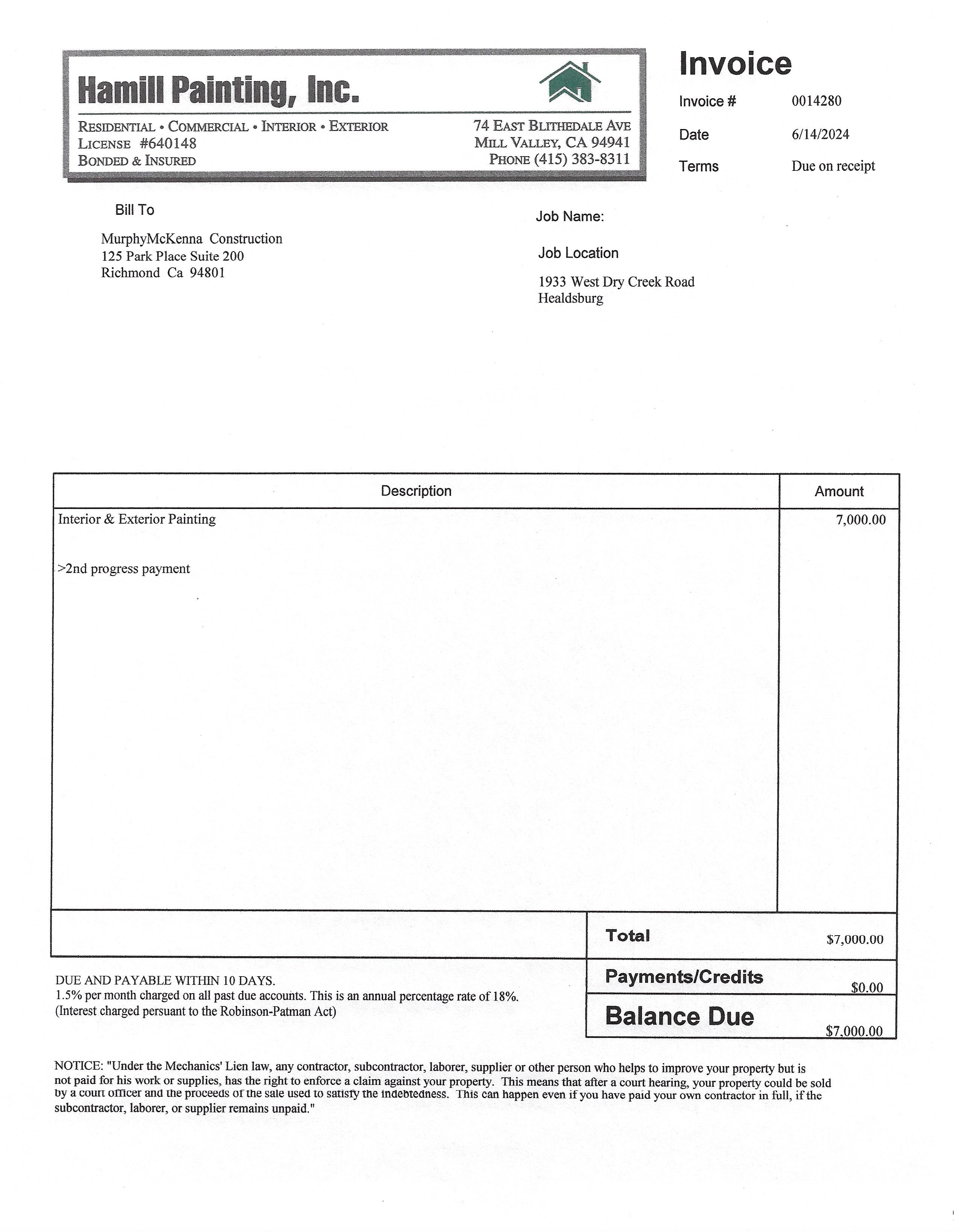 All estimates $2500.00 or above will require either 10% or $1000.00 deposit, as well as progress payment upon 50% completion.