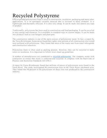 Recycled Polystyrene EPS (expanded polystyrene) foa m is used in construction, insulation, packaging and many other applications. It is an extremely versatile material that is resistant to many elements. It is lightweight and thermally efficient. It is also very cheap. It can be made into almost any type of product. Traditionally, polystyrene has been used in construction and food packaging. It can be recycle d to save energy a nd resources. It is available in standard sizes or custom shapes. It can be ma d e into products such as coat ha ngers a nd plant pots. The construction industry is one of the main sources of polystyrene waste. In fact, a report by the Yarra Riverkeeper Association found that eighty -nine percent of all construction sites tested were polluted with polystyrene. They found that most of the waste was from retail whitegoods and construction industries. Polystyrene foa m is often used as packing peanuts. However, they can be recycled to ma ke rulers or insulation. It is important to follow strict clean- up guidelines. A number of ma nufacturers are committed to recycled polystyrene. The company works with contractors to ensure that waste is collected and recycled. It c omplies with the Pod Code of Practice and Australian Standards AS 1336.3. A report by Yarra Riverkeeper found that millions of pieces of polystyrene were found in the Yarra River. The study investigated 80 construction sites in the Yarra River catchment ar ea. They found that 98 percent of the polystyrene on these sites was produced by the construction industry.