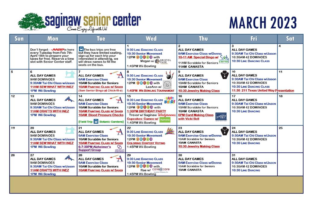 For More Calendar of Events, Visit Saginaw Senior Center on Facebook or call (817) 230-0459 633 West McLeroy Blvd, Saginaw, TX 76179