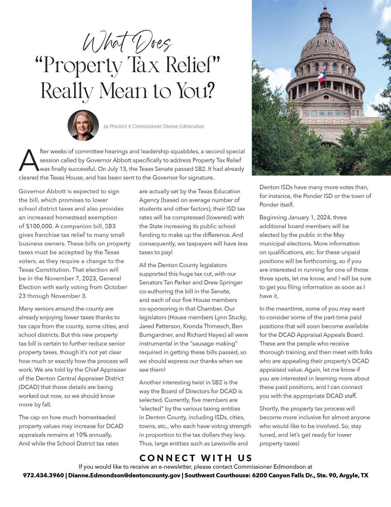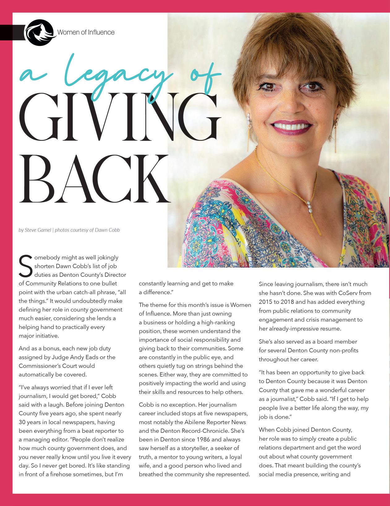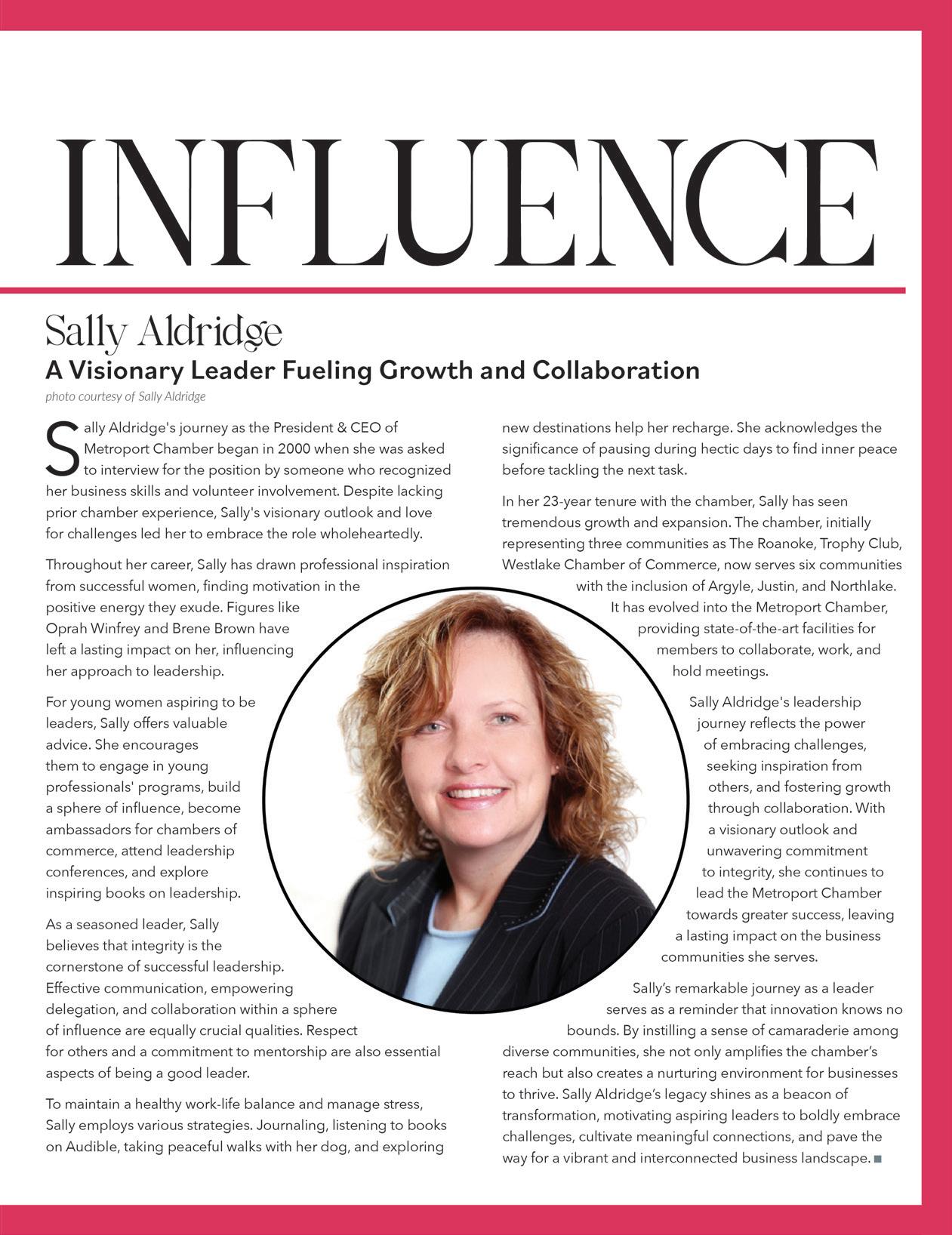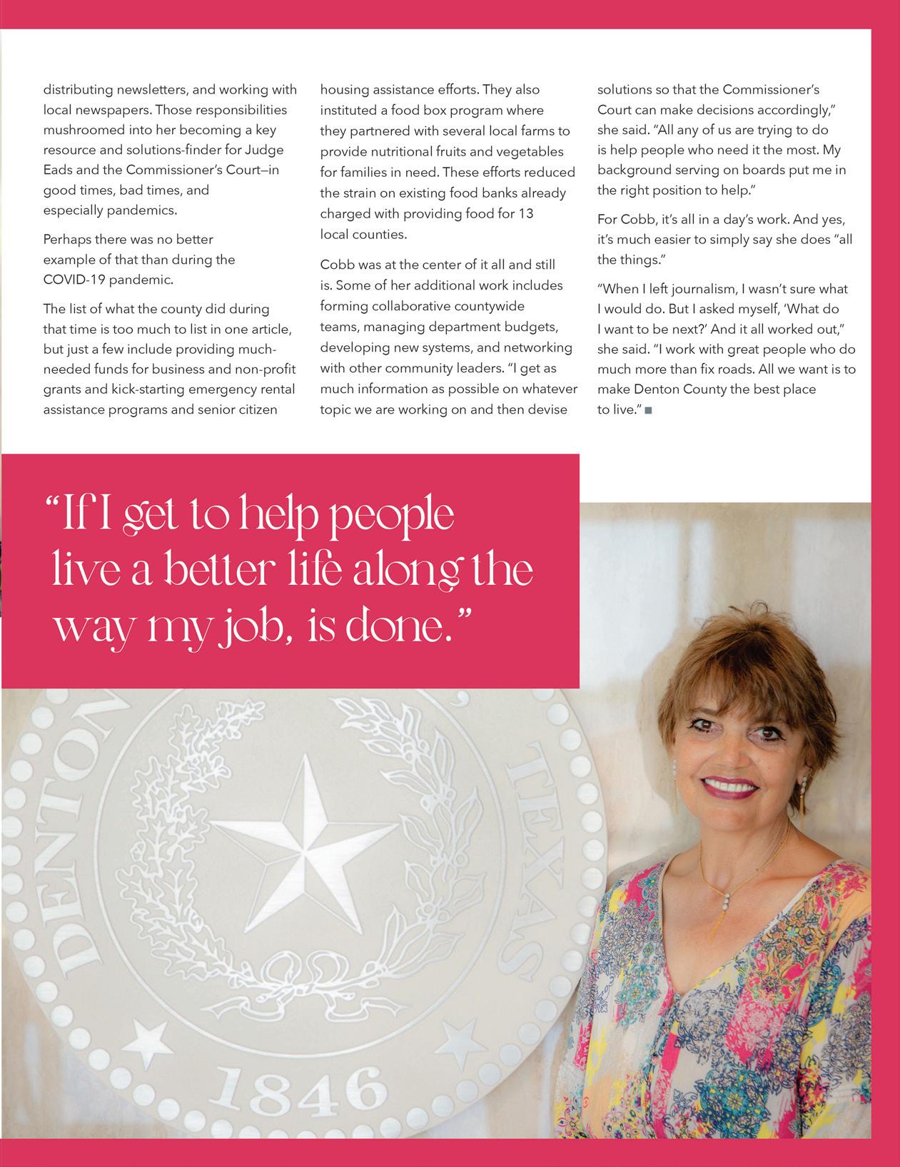 AUGUST 2023 | 35 WEST | 5 LiveLocalMagazines.com 22 Dawn Cobb - A Legacy of Giving Back 27 Dentistry With Country Lakes Family Dental 28 Senior Games Medalist, Ray Wright 29 5 Things To Try: Labor Day Activities 30 Roanoke’s New Learning Center 04 Strawberry Bliss Recipe 07 Lantana Pediatrics: Playing Outside, Why It’s Important For Kids 08 Ten Hot Labor Day Get-Aways 10 Dianne Edmondson - What Does Property Tax Relief Really Mean To You? 12 Lloyd Banks - Quitters Always Win 14 Sheriff’s Corner With Sheriff Tracy Murphree 16 Team Picks: Inspiring Women 18 Jennifer BurtonEmpowering Leadership 19 Sally Aldridge - A Visionary Leader 20 Patricia Peters - Creating World Hope & Peace CONTENTS 24 | ON THE COVER The Finest in Senior Care Opens in Argyle OF INFLUENCE Women 18-23 PGS