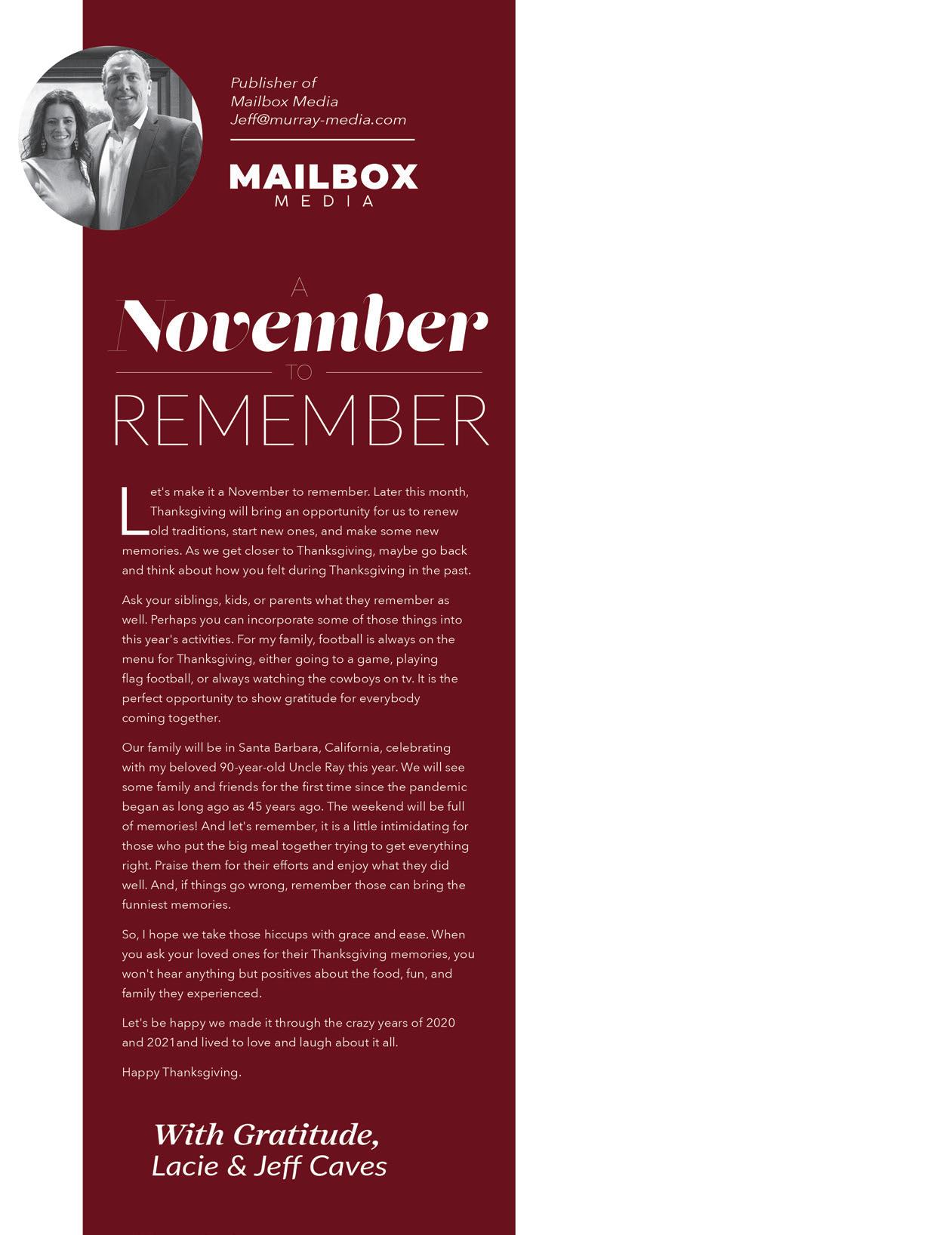 Editorial Inquiries Call 972.899.3637 or email editor@murray-media.com Address: Mailbox Media L.L.C. 2591 Lakeside Pkwy., Ste. 200 Flower Mound, TX 75022