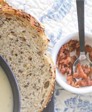 4. Serve hot garnished with crumbled bacon and snipped chives (if desired).