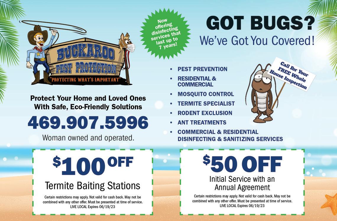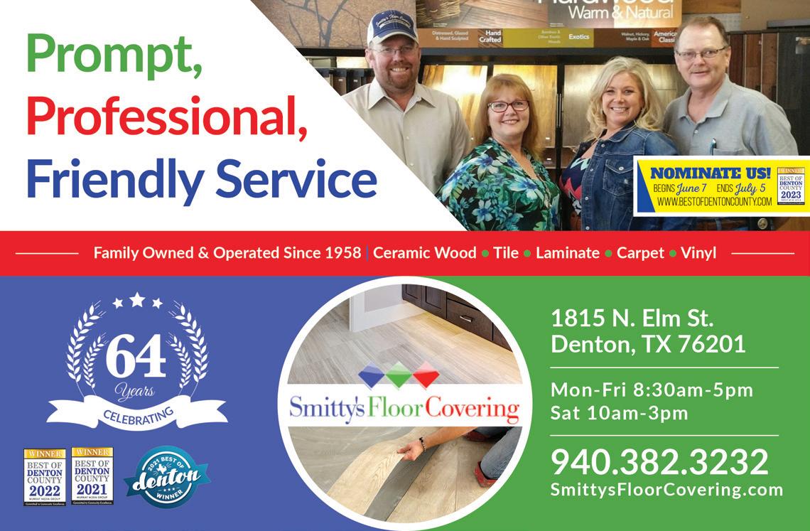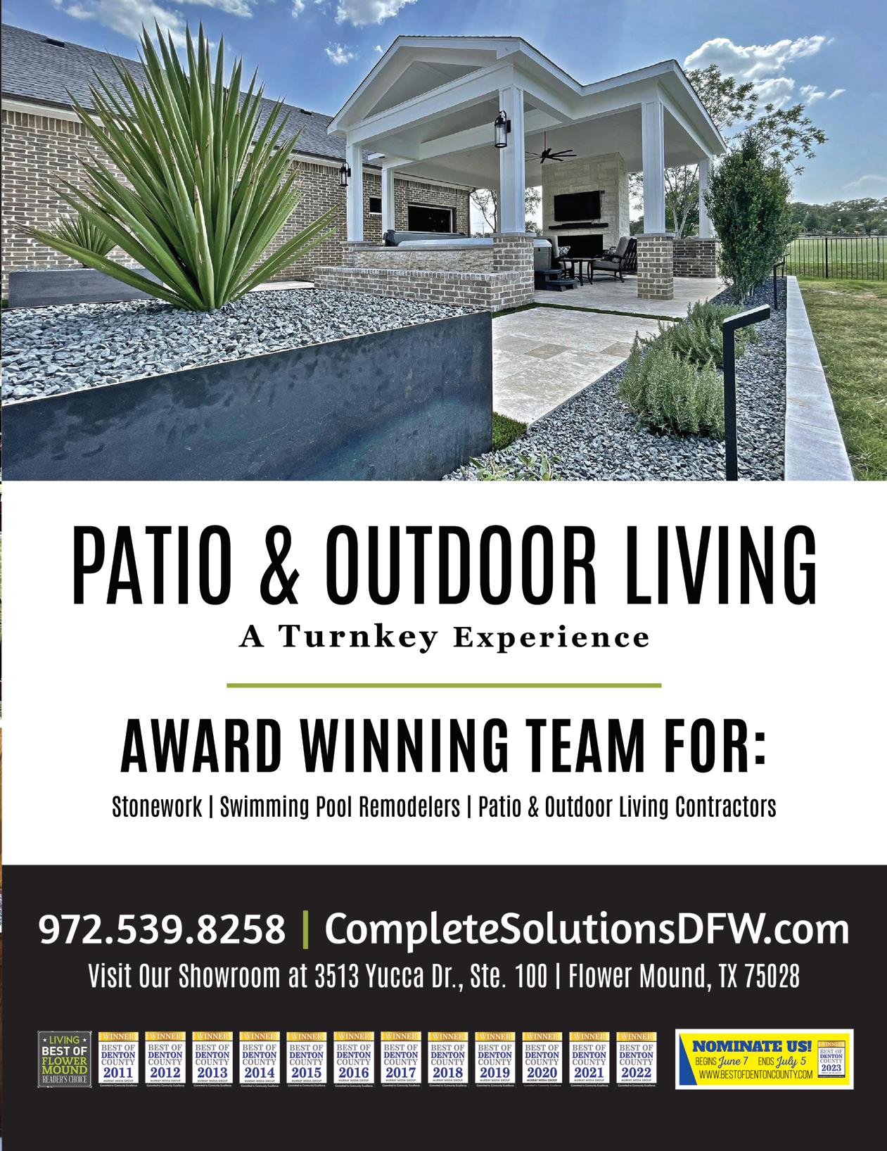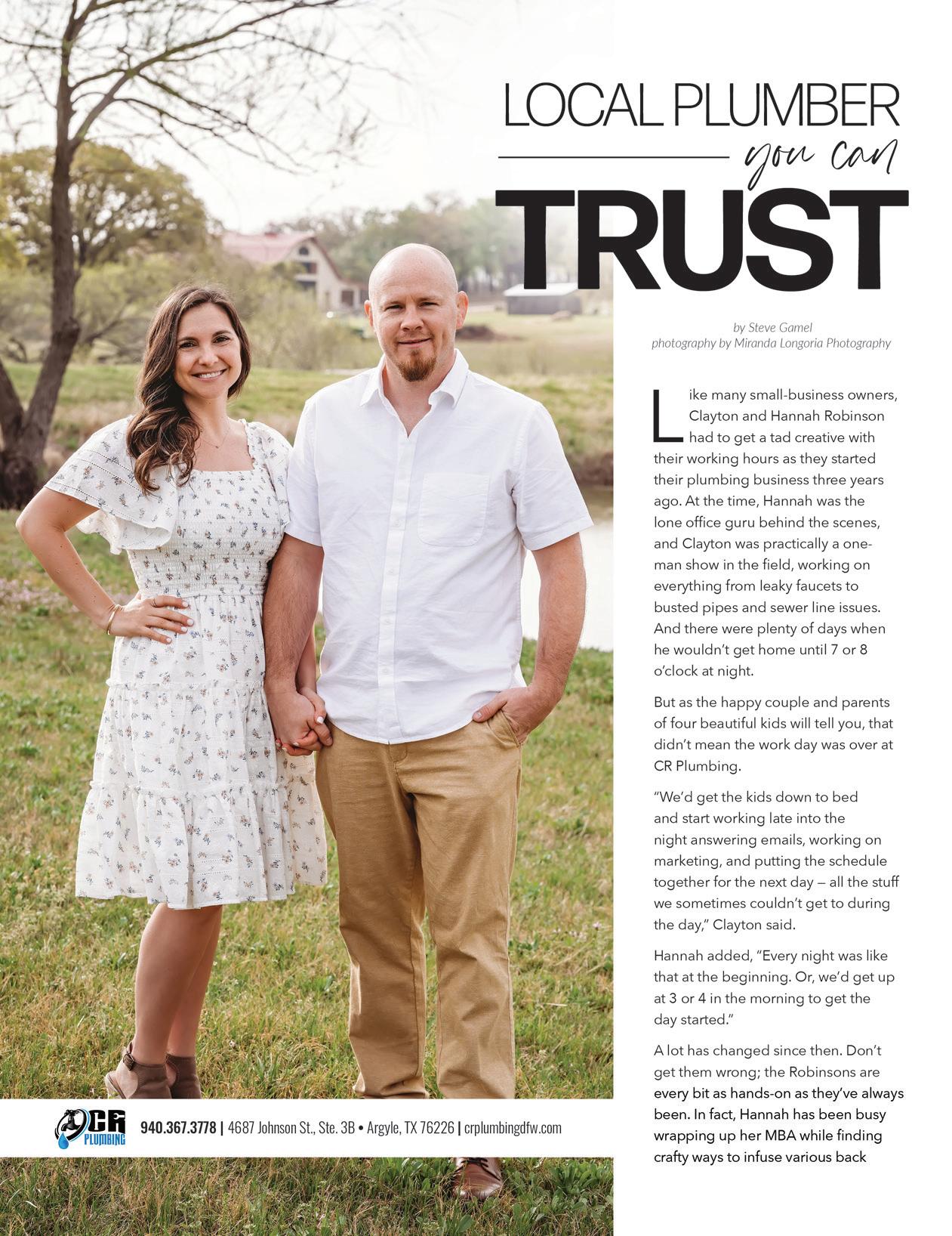 MAY 2023 | ARGYLE LIVING | 5 LiveLocalMagazines.com 08 Ten Hot Interior Design Trends 10 Gardening with Complete Solutions 12 Master Your Morning Routine 14 Commissioner Dianne Edmondson: Behind The Scenes 16 Lantana Pediatrics: Five Things Parents Can Do To Help Prevent Suicide 21 Dentistry with Country Lakes Family Dental 23 Sheriff’s Corner with Sheriff Tracy Murphree 24 The Big Debate: What is the Better Dad Joke? 28 Team Picks: Summer Activities Contents 26 | On The Cover Clayton and Hannah Robinson with CR Plumbing 30 Healing With Horses 32 Medal of Honor Motorcade 34 Baseball & Beyond 36 5 Things To Try: Home Improvement DIY 38 Ways to Celebrate Father’s Day With Young Children 41 7 Ways to Upgrade Your Home 43 Gifts for Teachers 44 The Happy Camper Guide
