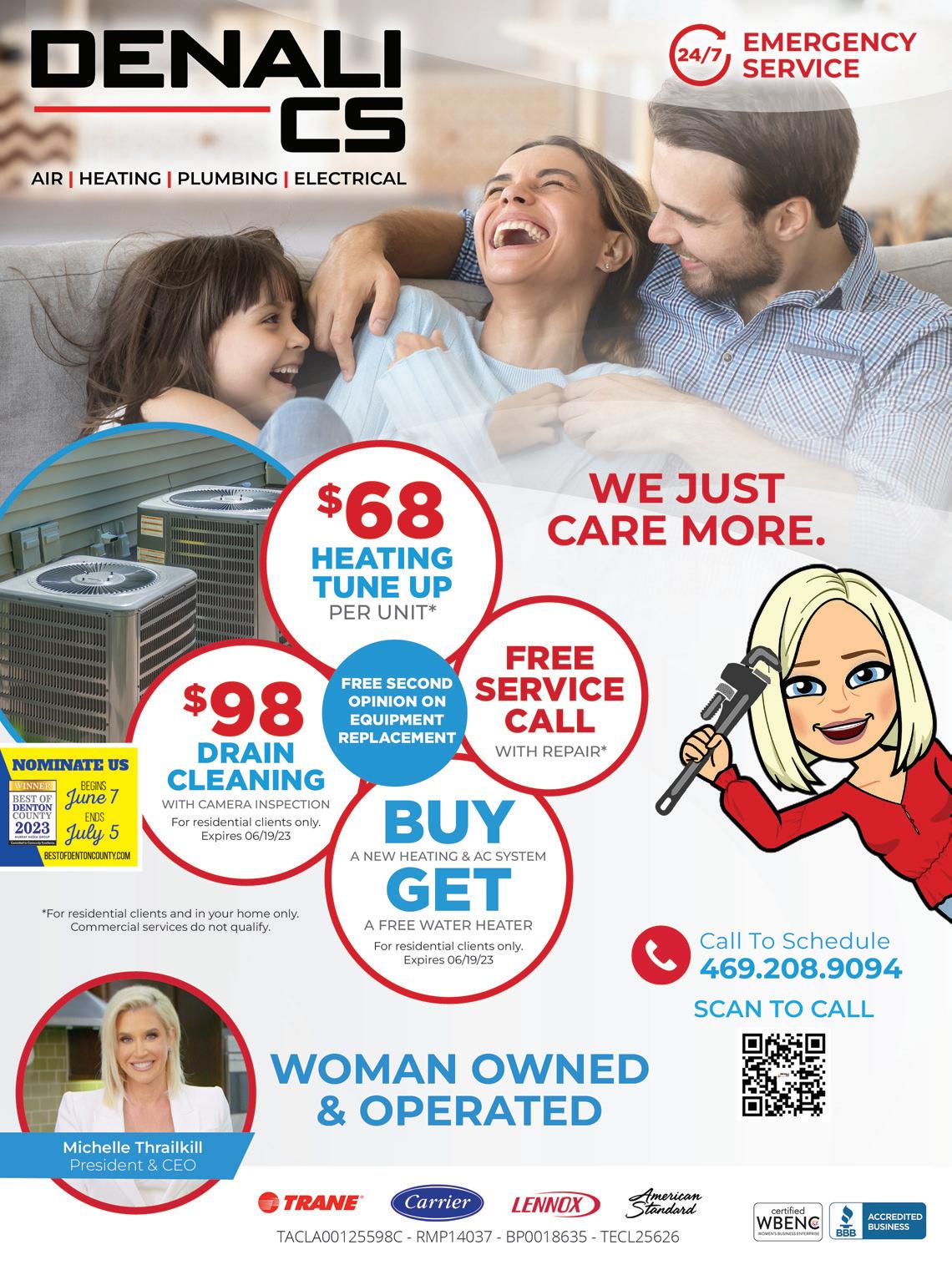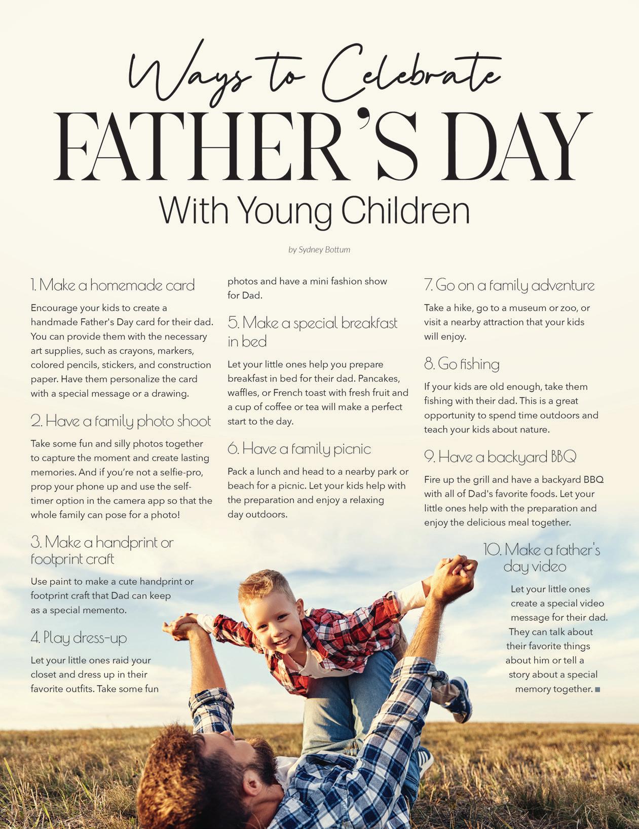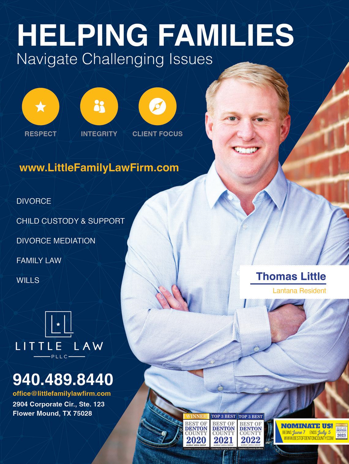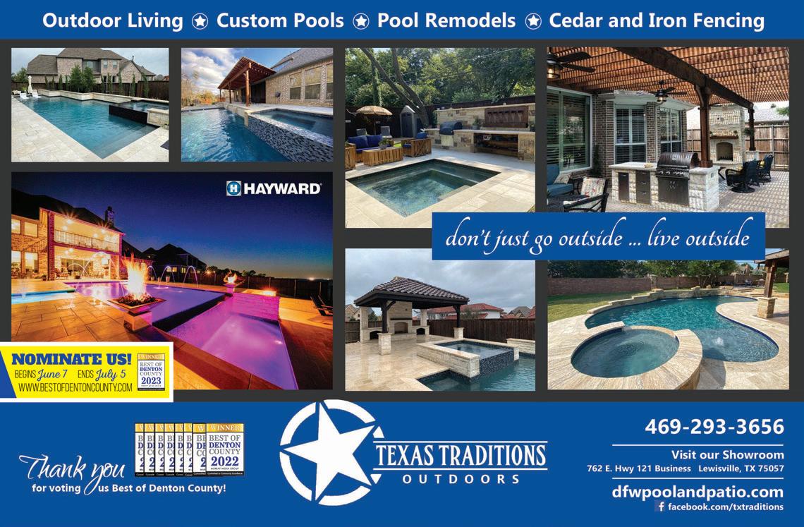 MAY 2023 | ARGYLE LIVING | 5 LiveLocalMagazines.com 08 Ten Hot Interior Design Trends 10 Gardening with Complete Solutions 12 Master Your Morning Routine 14 Commissioner Dianne Edmondson: Behind The Scenes 16 Lantana Pediatrics: Five Things Parents Can Do To Help Prevent Suicide 21 Dentistry with Country Lakes Family Dental 23 Sheriff’s Corner with Sheriff Tracy Murphree 24 The Big Debate: What is the Better Dad Joke? 28 Team Picks: Summer Activities Contents 26 | On The Cover Clayton and Hannah Robinson with CR Plumbing 30 Healing With Horses 32 Medal of Honor Motorcade 34 Baseball & Beyond 36 5 Things To Try: Home Improvement DIY 38 Ways to Celebrate Father’s Day With Young Children 41 7 Ways to Upgrade Your Home 43 Gifts for Teachers 44 The Happy Camper Guide