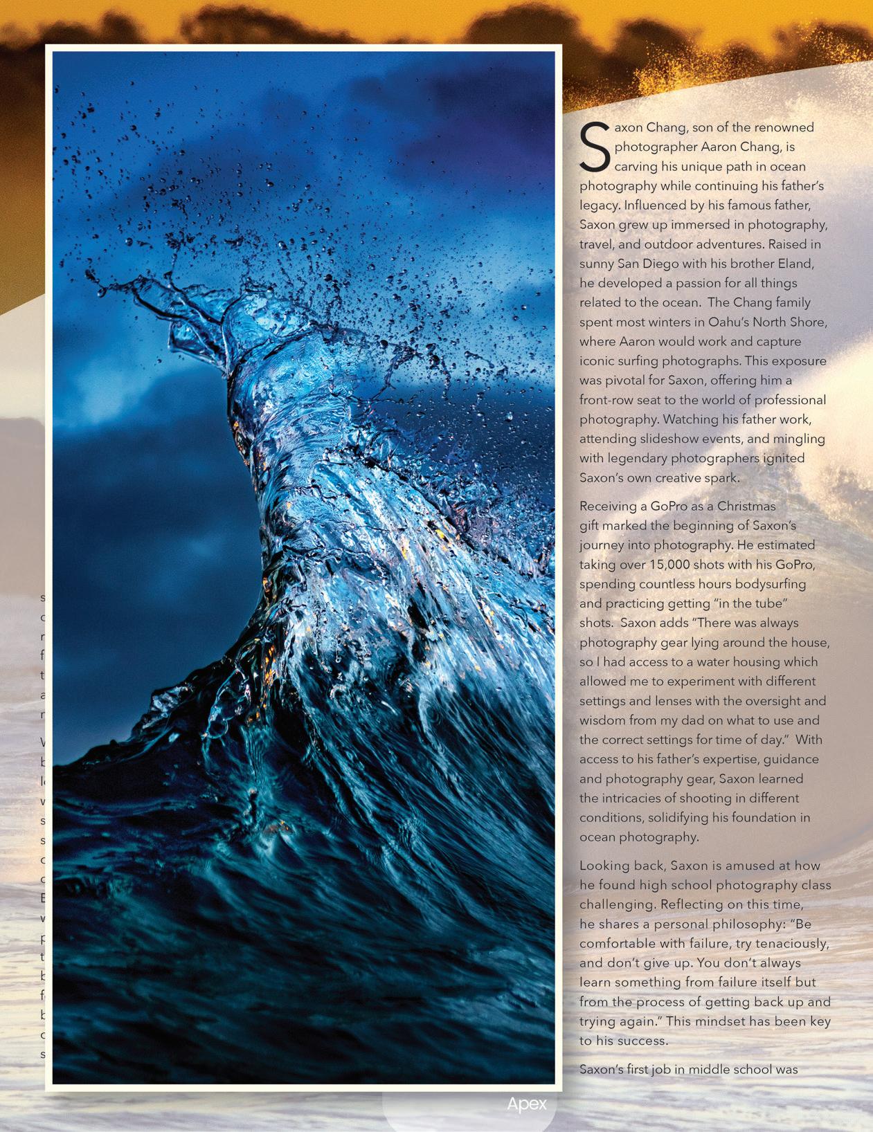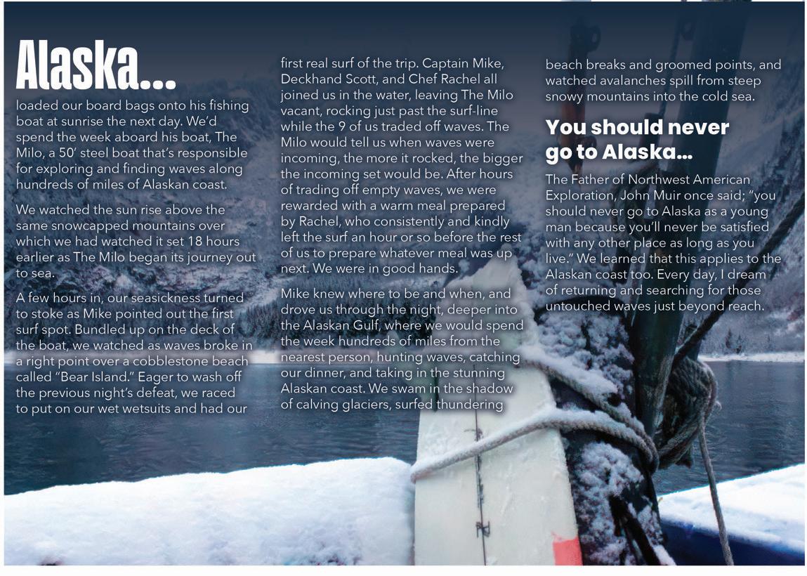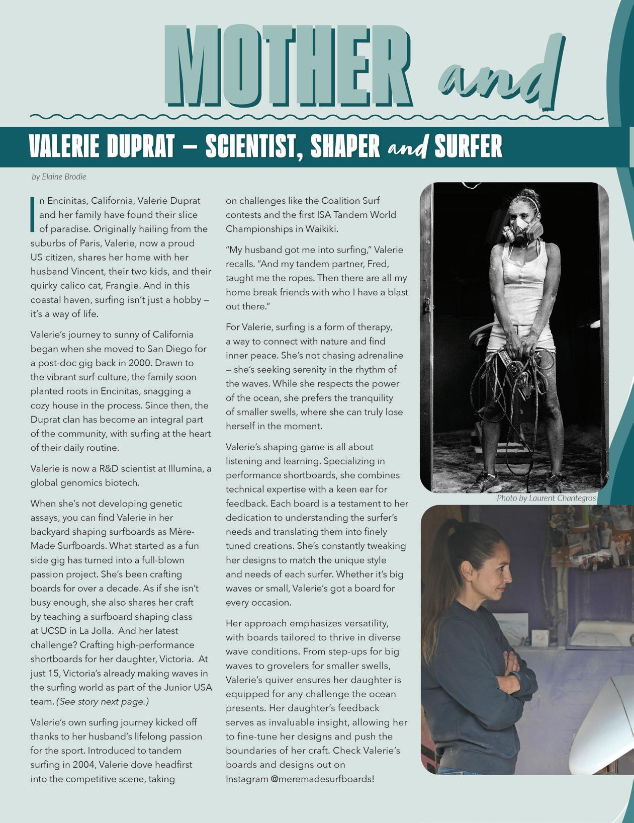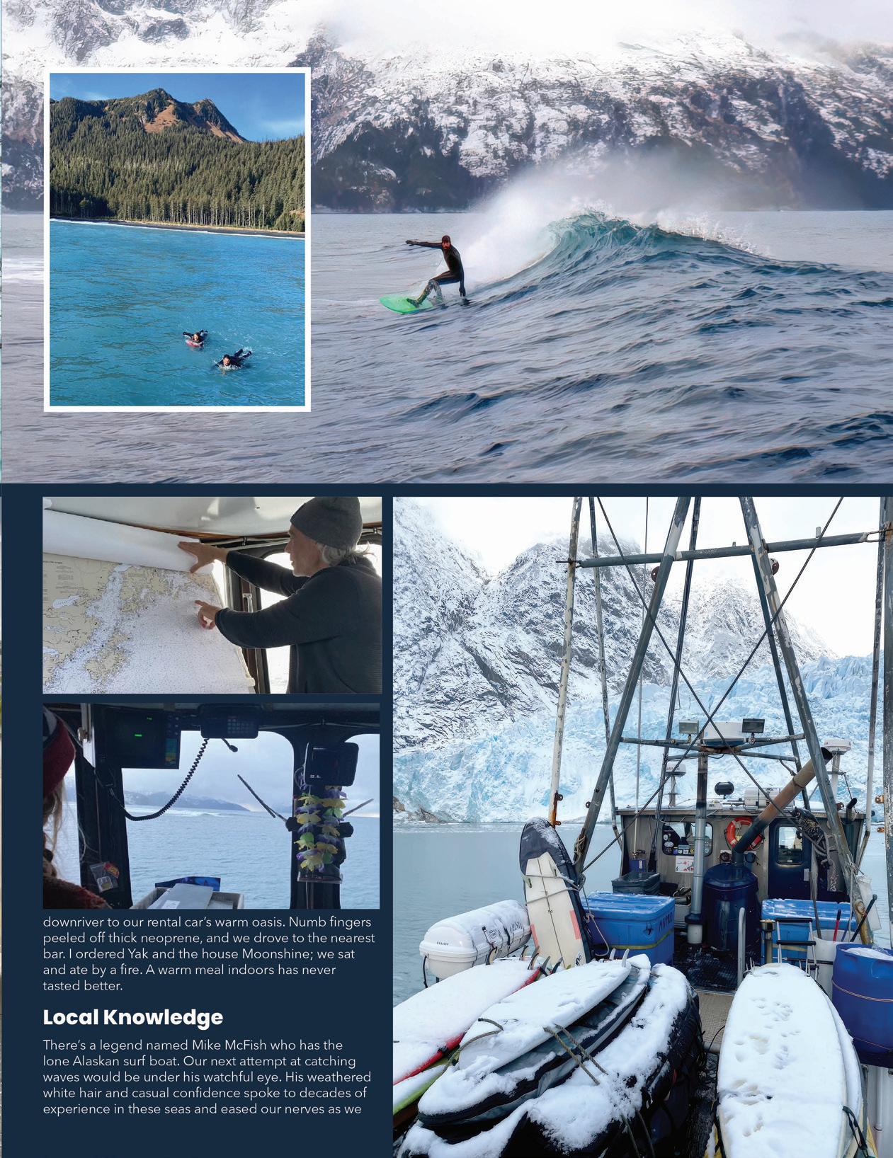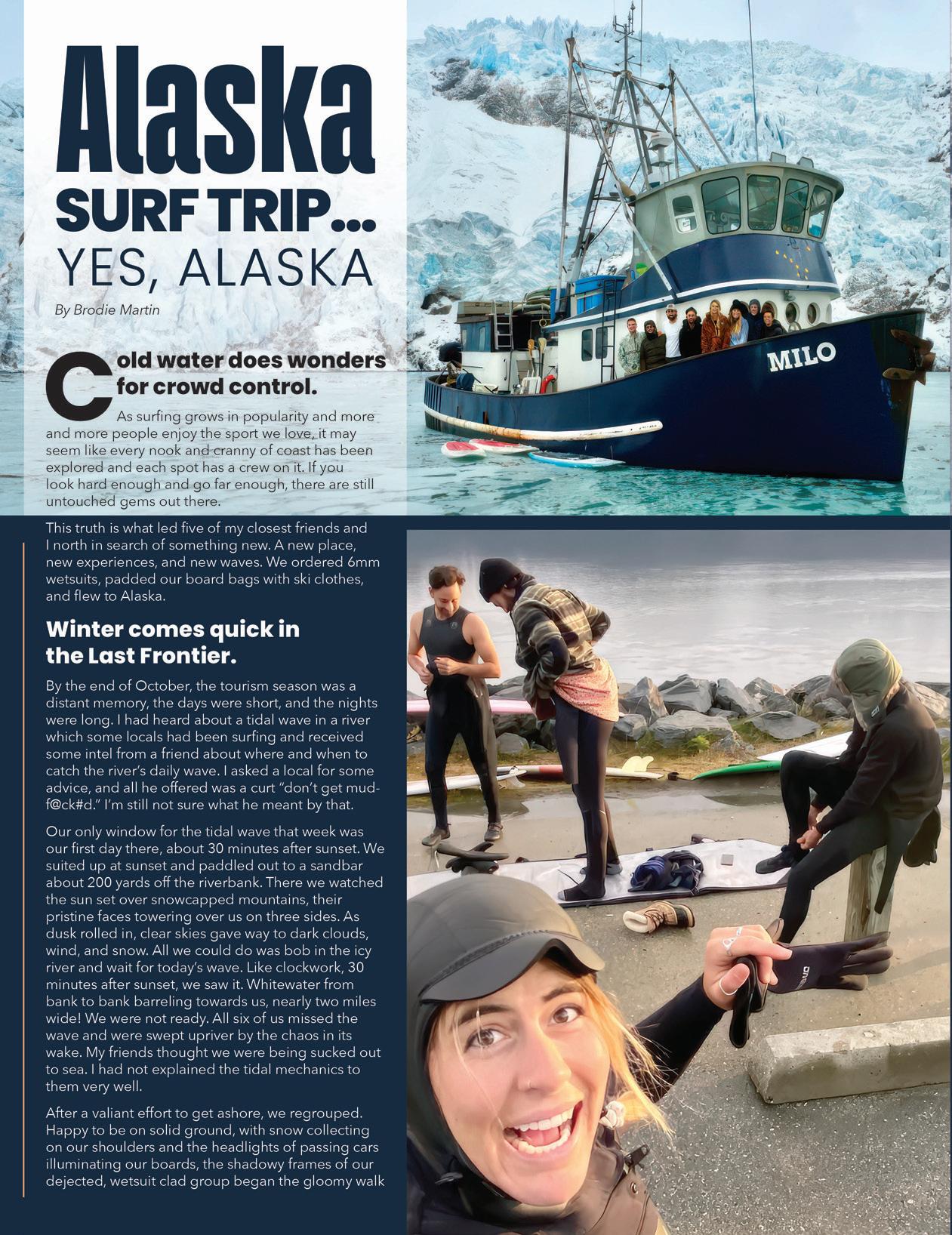A huge thank you goes out to everyone who contributed articles and content, as well as to our sponsors who took the leap and advertised with us. We’re proud to present a wide array of stories in this issue. From the stunning photography of emerging artist Saxon Chang to the inspiring story of Valerie Duprat, one of the few female board shapers, and her daughter Victoria, a rising star in the world of surfing. We’ve also got some fantastic articles on health and fitness, and even a chilling tale of surfing in the icy waters of Alaska.