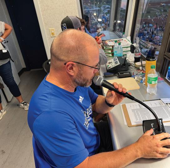He credits much of the smooth operation in the booth to his long-time crew: Chris Ladd, who runs the sound board and music, and Brad Shanks, who operates the scoreboard. “We’ve had the same crew for four seasons now,” he says. “We feed off each other and have a great time.”