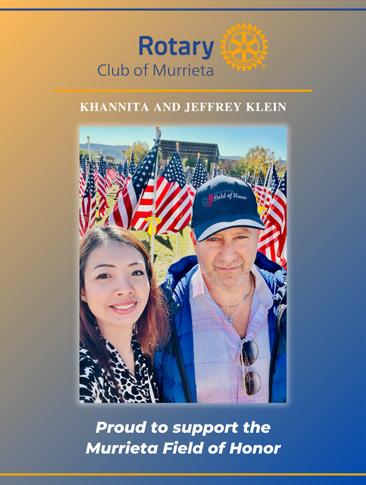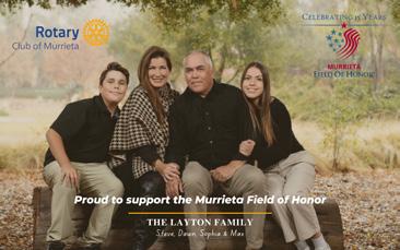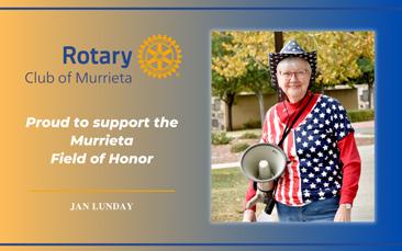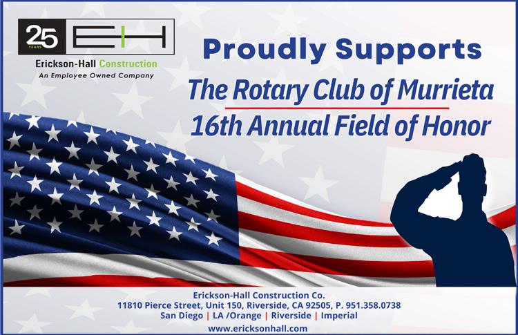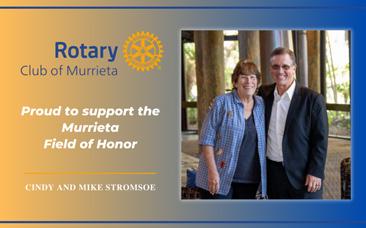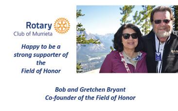 The Rotary Club of Murrieta and Rotary Club of Old Town Temecula are honored to bring this special field of flags and the related activities to you. We recognize that none of this would be possible without the support of our partner, the City of Murrieta, and our generous sponsors, hard-working affiliates and tireless volunteers. Thank you all for being a part of our 16th annual Murrieta Field of Honor.