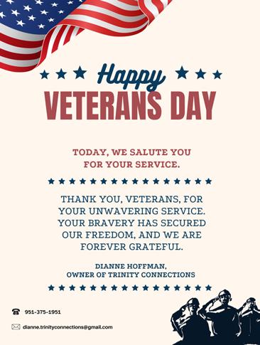 Veterans Day today continues to recognize all veterans, both living and deceased. Each year, there is a wreath-laying ceremony at Arlington National Cemetery near our nation’s capital, which takes place on Veterans Day, while parades and other celebrations are held across our great nation. Here in Murrieta, we are blessed to have the Field of Honor each year at this time to remember, recognize, and honor our veterans. This year, the city's Veterans Day Parade will take place on November 11, 2024, beginning at 10 AM and ending at the Field of Honor.