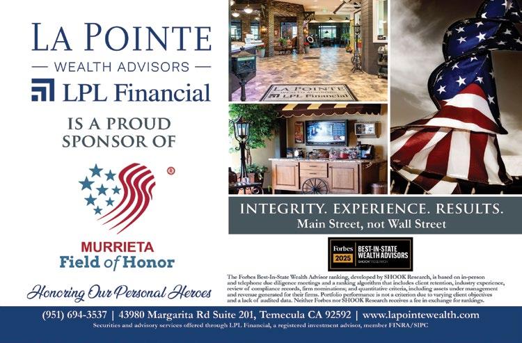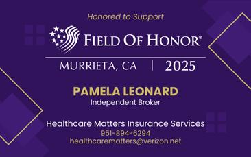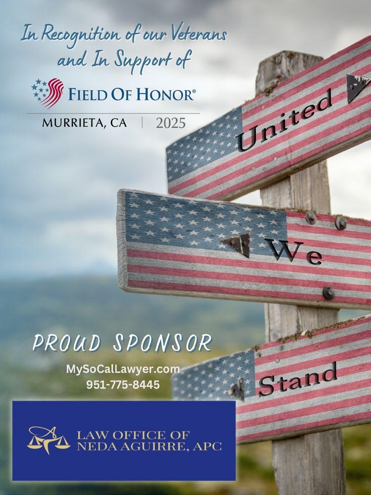 Welcome to the 2025 Murrieta Field of Honor®. As we are about to celebrate the 250th year since the birth of the United States of America, we are thankful to be celebrating the 17th year of presenting the Field in Town Square Park of Murrieta.