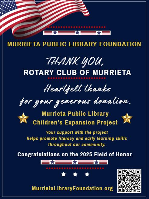 The Rotary Club of Murrieta and Rotary Club of Old Town Temecula are honored to bring this special field of flags and the related activities to you. We recognize that none of this would be possible without the support of our partner, the City of Murrieta, and our generous sponsors, hard-working affiliates and tireless volunteers. Thank you all for being a part of our 17th annual Murrieta Field of Honor®.