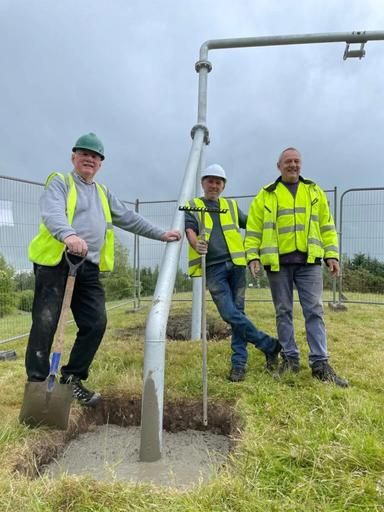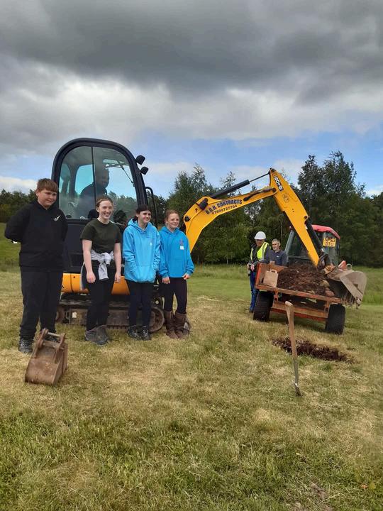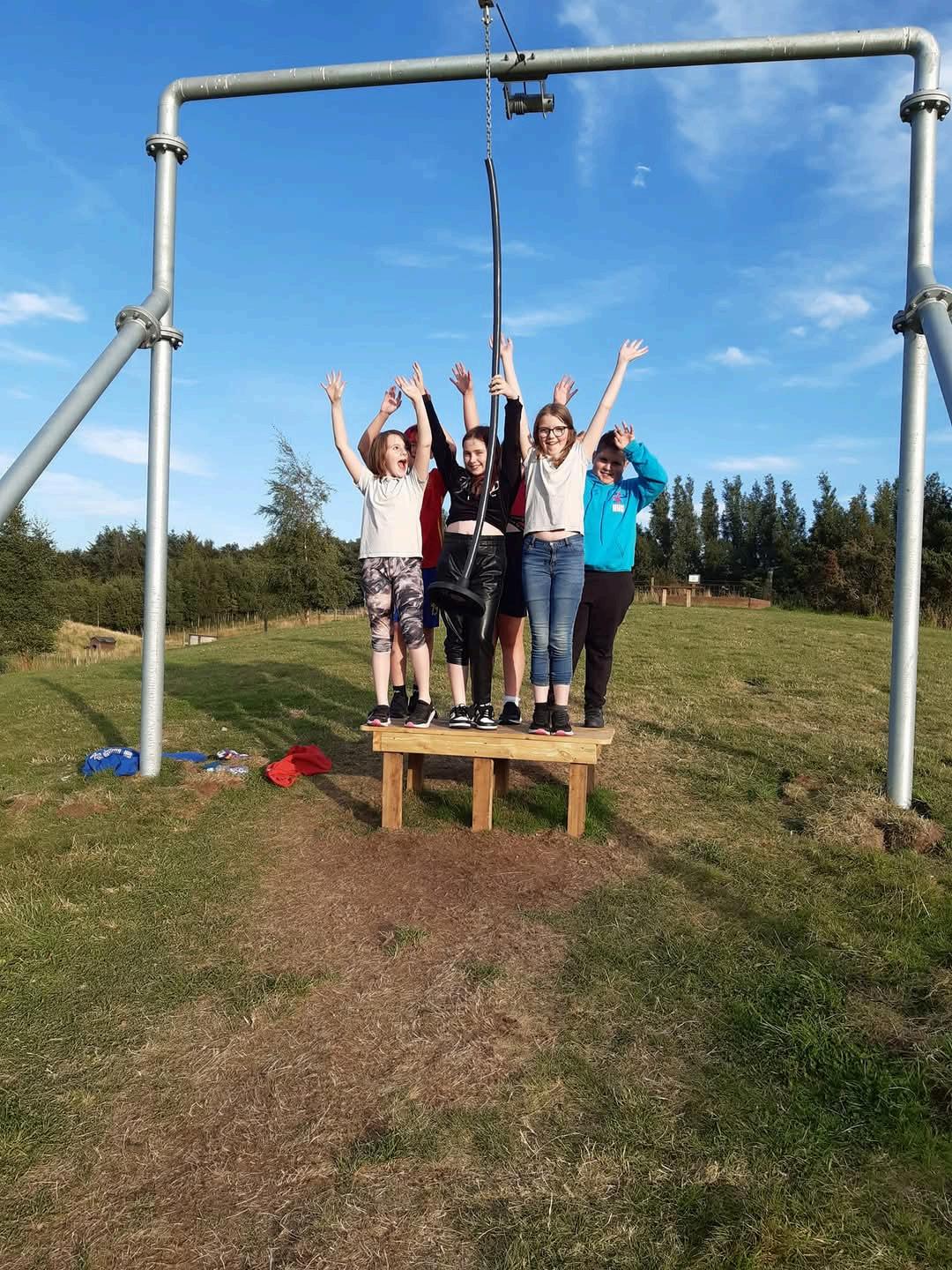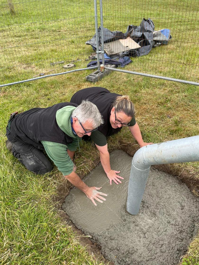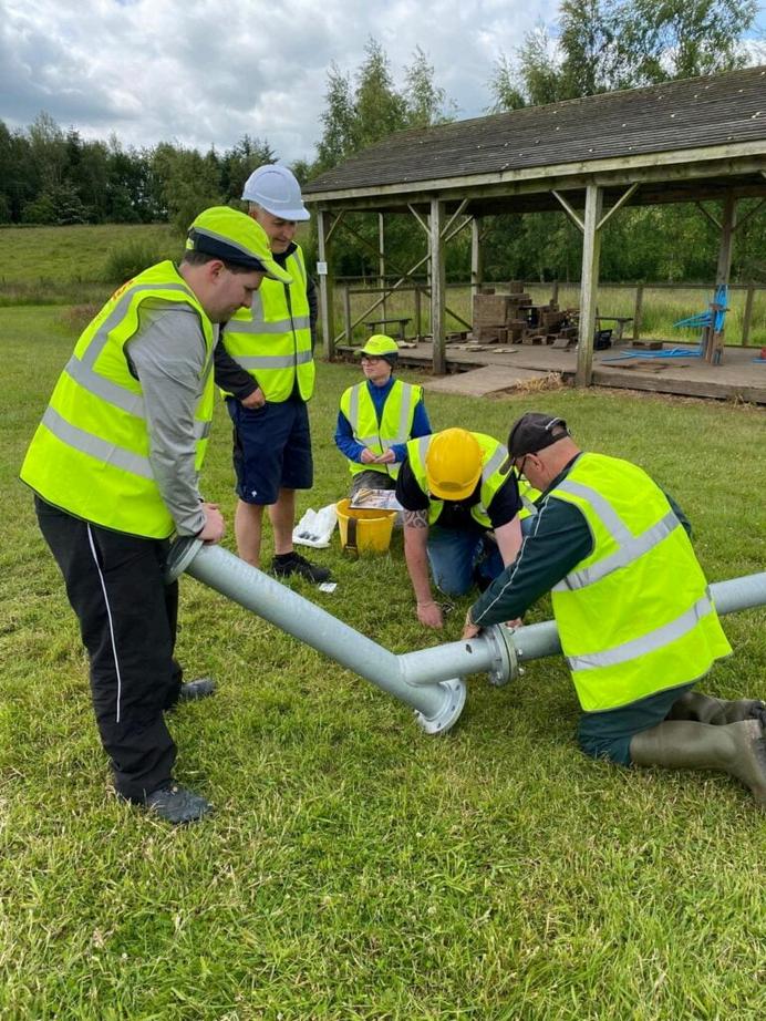 Macari Hill Civil Engineering Ltd, Glenrothes enabled this final push to get started, providing heras fencing feet and clamps to ensure safety on the farm as building work began. Scanstone Potato Systems provided high-vis vests and hard hats for the work period. Young volunteers from Angus Young Carers broke ground, cutting the turf for the eight frame holes. This was then followed by the staff and machinery of BGH Contracts Ltd, Forfar digging the 8 large holes required for the frame on site. Merchandisers from CCEP provided manpower during a company volunteering day, far then provided the concrete umes Murton required as their fell to the young volunteers of mportant testing of the zip wire! ou – Kevin and Brenda Dear, Phil Craig Hill, Les Davidson, Heather nd Kevin the Concrete King
