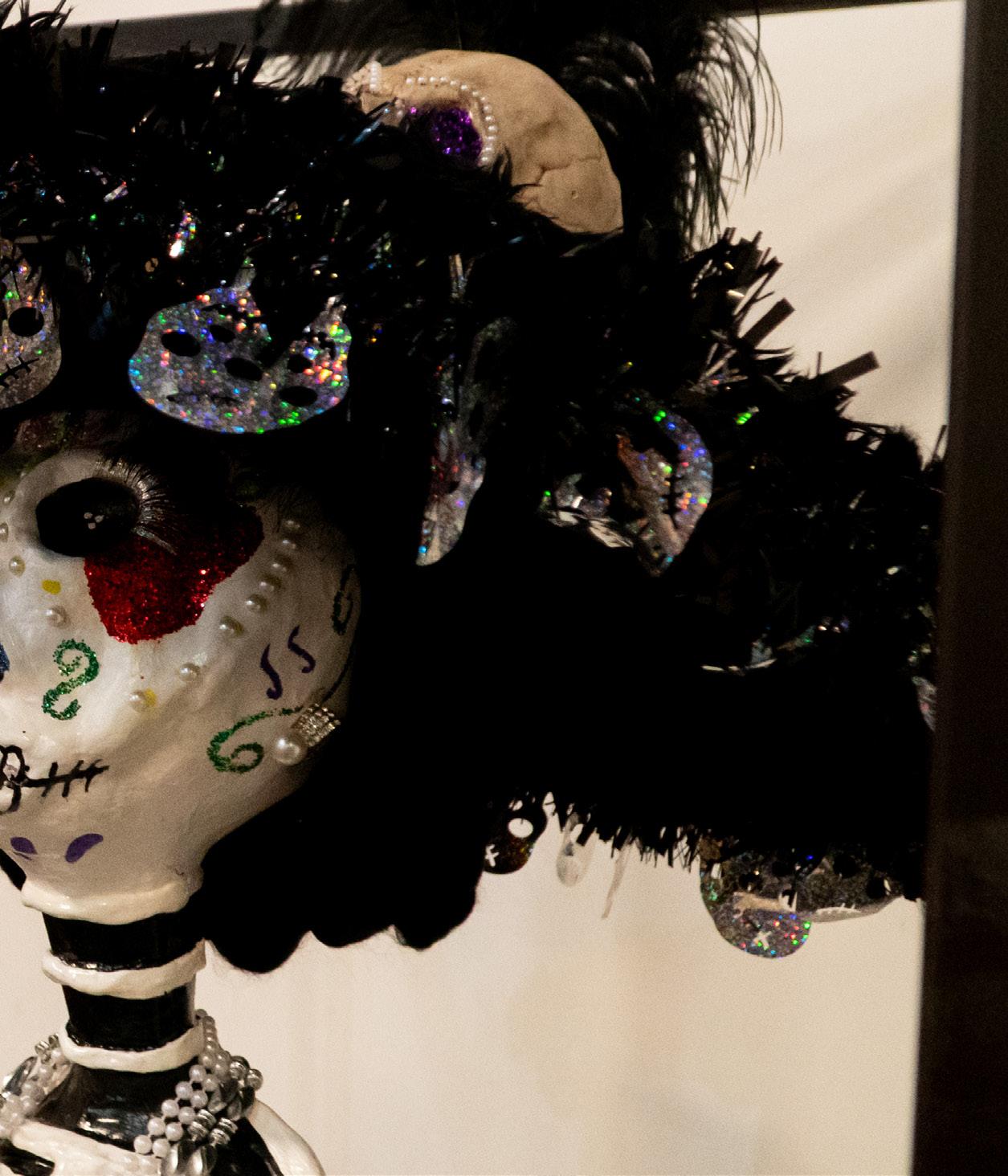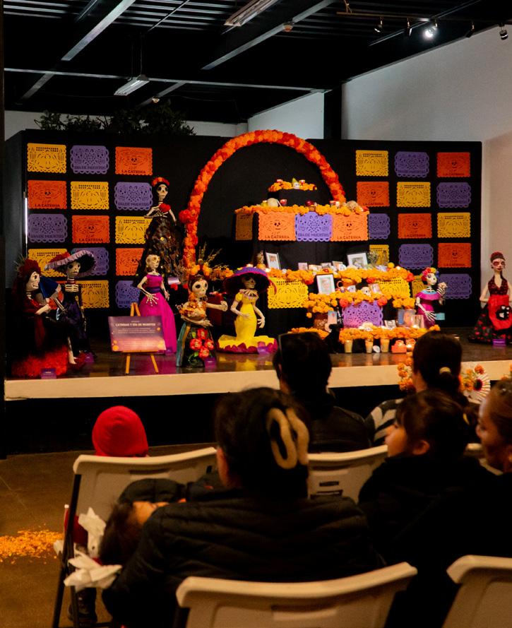 El altar también incluyó la exposición “Catrinas y Día de Muertos”, con esculturas de catrinas creadas por el grupo Catrinas Cartoneras de Ensenada, resultado del taller impartido por la artista plástica Brenda Silva. a.