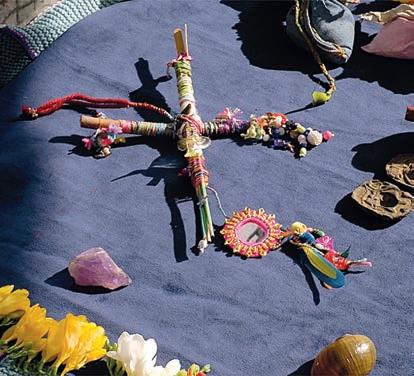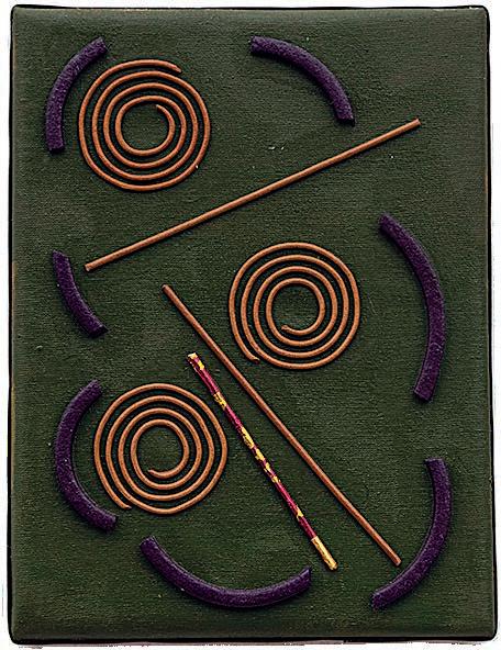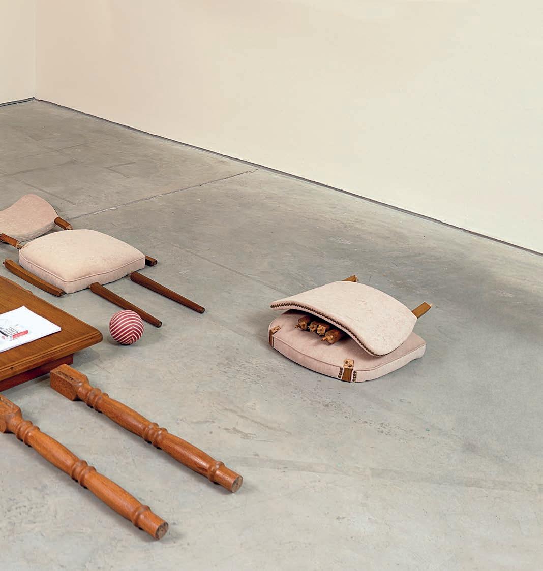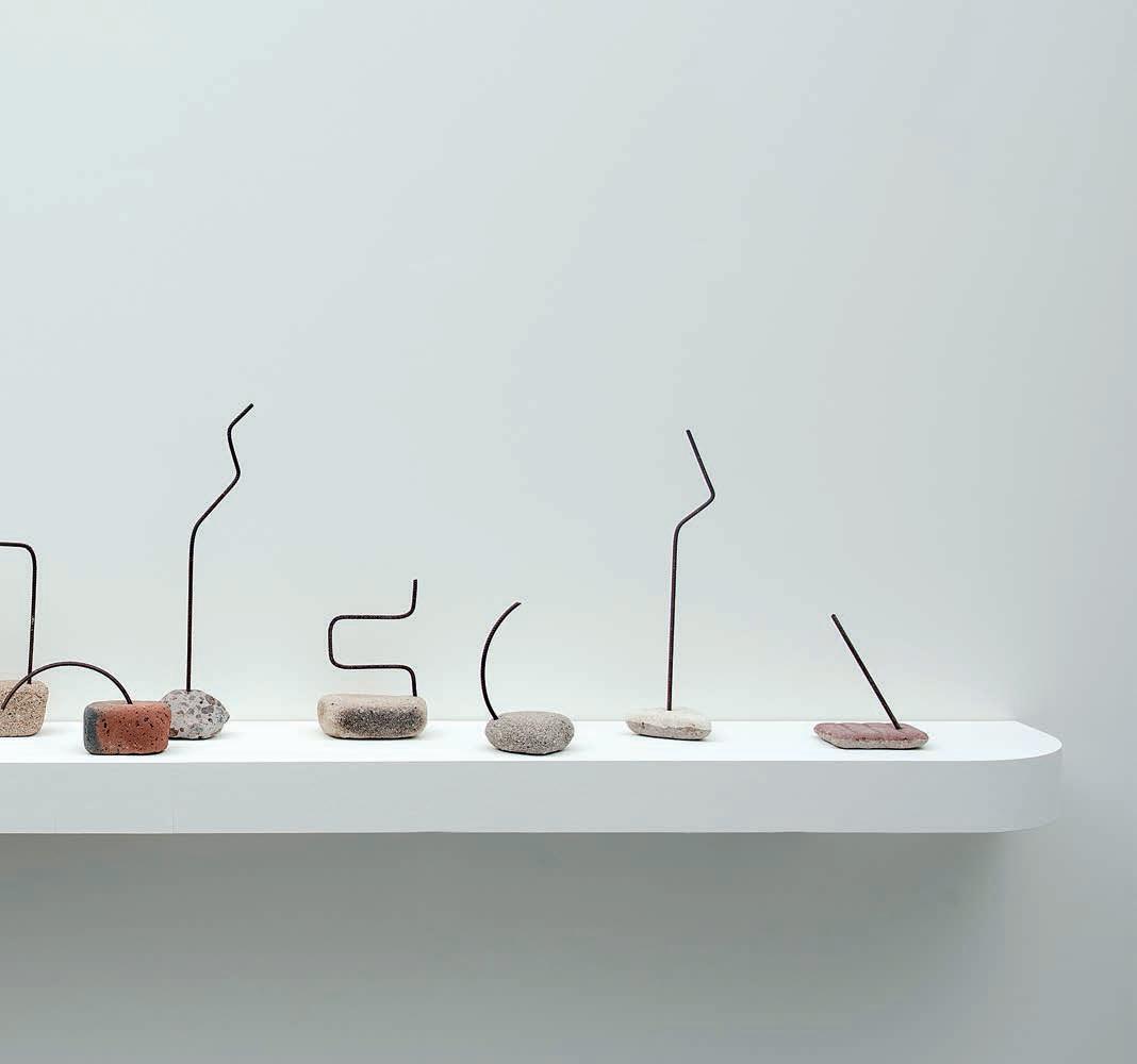 – where the artist grew up – and industrial and craft incense burners made using the macramé technique. This piece seeks to eliminate the historic tension between art and craft: techniques and materials that have their own symbolic, spiritual and private value have their power enhanced by a sculptural form in which objects on a domestic scale present a new collection of floating symbols that can be interpreted as house, landscape and body simultaneously. The usual purpose of the materials used is to be burned as incense during a mystical ritual, expressing power with their aromas, which lend them an invisible, evocative dimension.