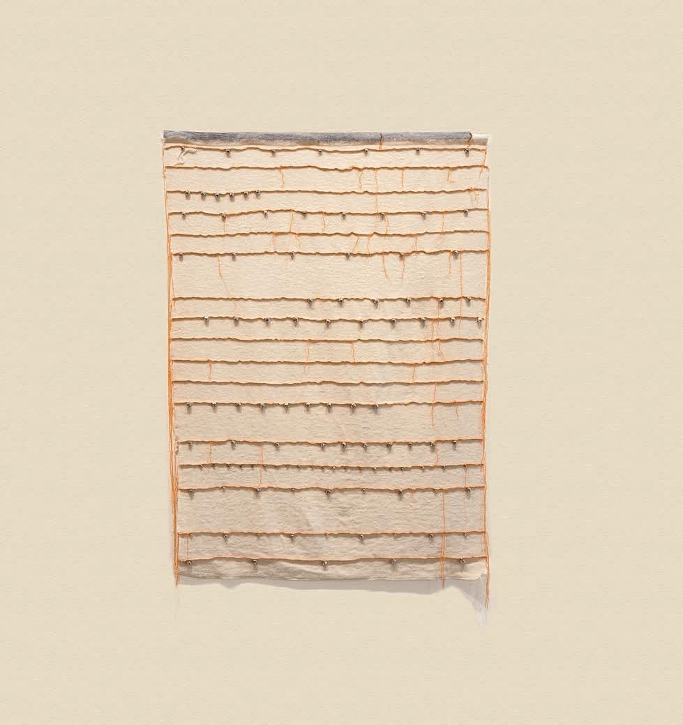 The artwork Trapo sonajero by Jimena Croceri adds a new dimension to a set of used domestic rags: the artist has sewn bells to them so as to produce sound. Her work is aimed at making audible the objects and actions of our everyday life to highlight their essential role in maintaining our environment as well as in creating modes of communication of which we are not aware. When animated, these objects are capable of giving rise to new experiences for the viewer and revealing a network of emotional, vital and sound-based connections between them, our bodies, the air and the water. Their activation also reveals the unique character of each and every encounter: in the case of the elements in Trapo sonajero, the sound that arises from their movement is determined by the specific rhythm of the orange lines one often sees in cleaning cloths – the gleaming line of bells which appear as though set out in a musical score – the dimension and quality of the cloth, the spaces between the stitching and, most of all, the force with which one shakes them, or the wind.