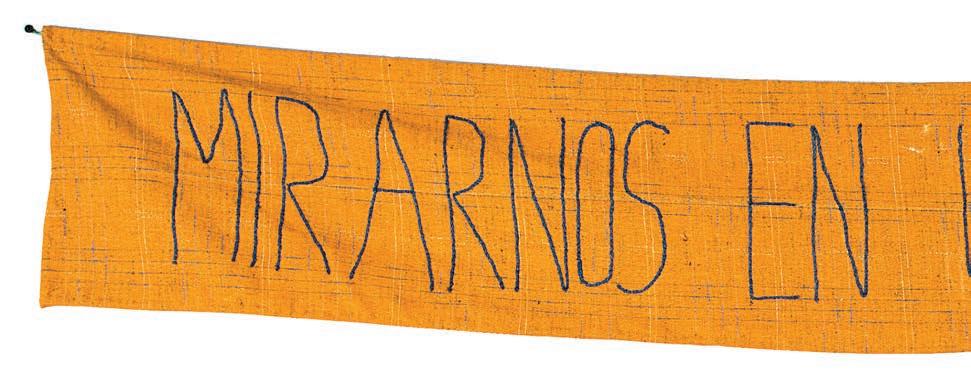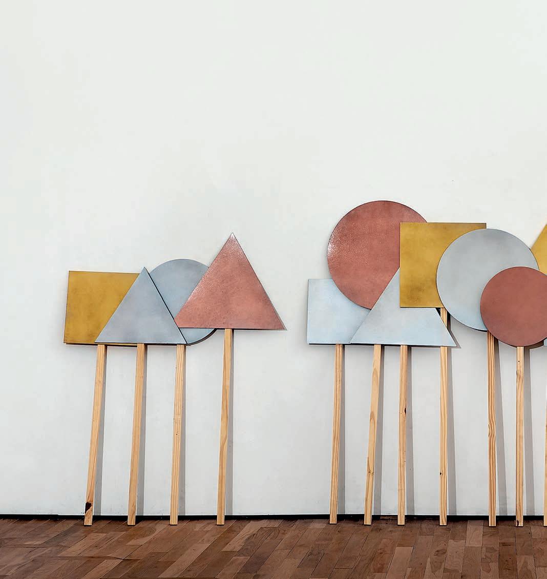 A set of geometric shapes rises up in silent proclamation. The artwork Manifestación by Soledad Dahbar is composed of the repetition and grouping of circles, squares and triangles attached to wooden poles to form a group of resting signs that combine artistic and political activism. The proportion of the colours copper, silver and gold reflects the percentages of these minerals in the soil and mountains of northwest Argentina, which are being exploited by massive mining concerns. The way the signs are laid out to form a horizon and silhouette of polychrome mountains symbolizes the return of the metals extracted from the landscape to their original state in the ground. This dimension of the artwork is accompanied by an aesthetic dimension in which simple shapes combine with the bright colours – in resonance with the landscape – and