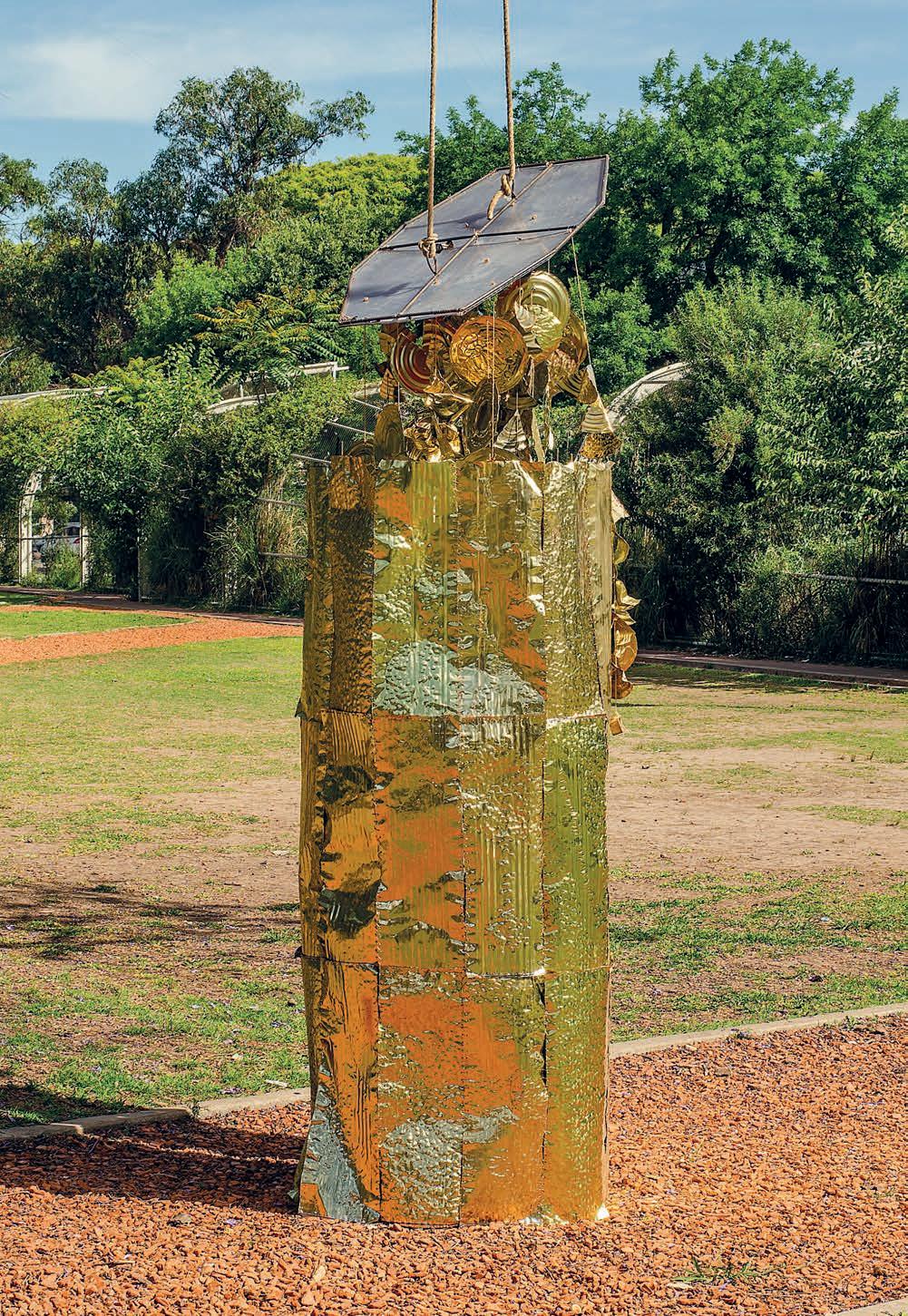 / shed / oven / incense burner... a spatial cabinet, a place in which to stay and make wishes, somewhere to burn bay leaves,’ that can be both threatening and playful. This is Denise Groesman’s description of a tin structure made from discarded tomato cans that, modified by the artist – who cleans, solders, hammers, softens and polishes them – create a malleable, reusable structure for a gleaming, musical, habitable space. The title – taken from a poem by the Brazilian poet Douglas Diegues who is recognized for his use of an exuberant language arising out of a mixture of Portuguese, Spanish and Guaraní – expresses the idea of fusion in the artwork whose shape makes it a multiple symbol, both dystopian and uplifting.