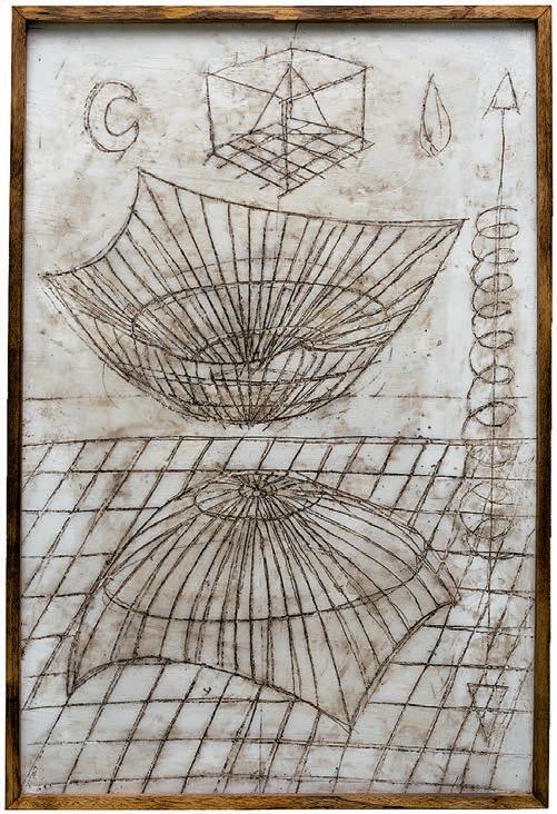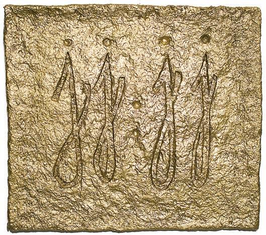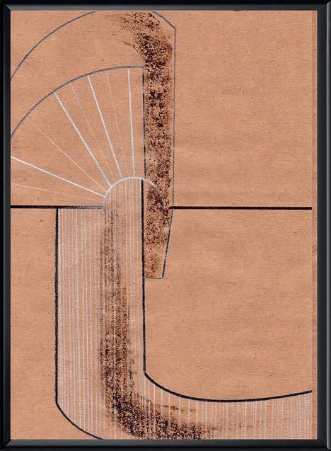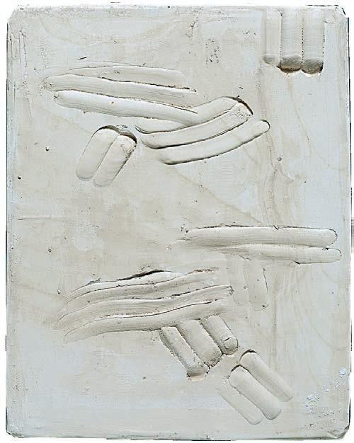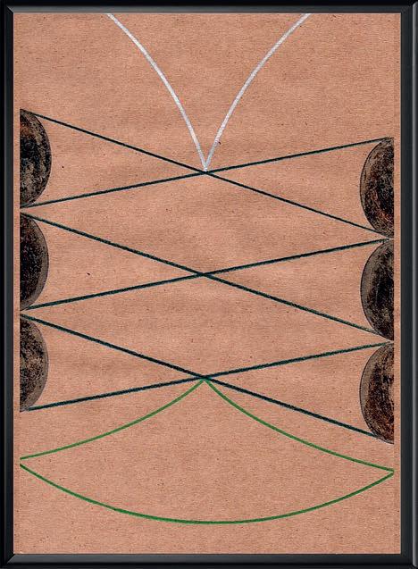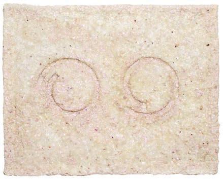 conceives these pieces as a means of transferring abstract ideas about love to symbols made from pasta stuck to paper, which turns out to be a surface as resilient and noble as stone. The spirals, letters and marks, traced in symmetrical order, establish a code for an encounter within the private, emotional and territorial space from which the artist produces.