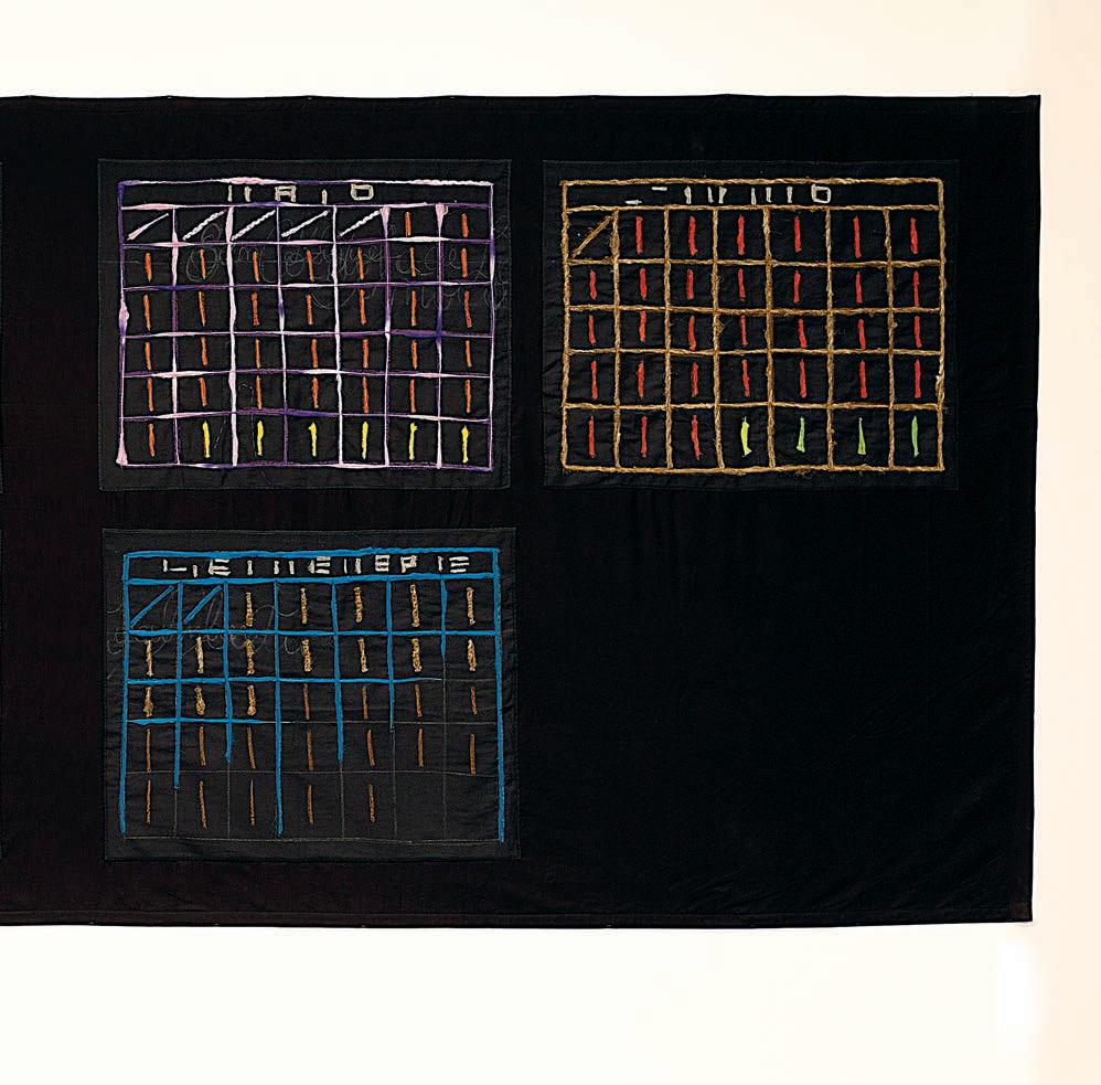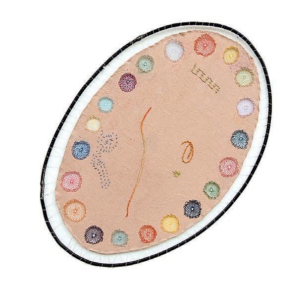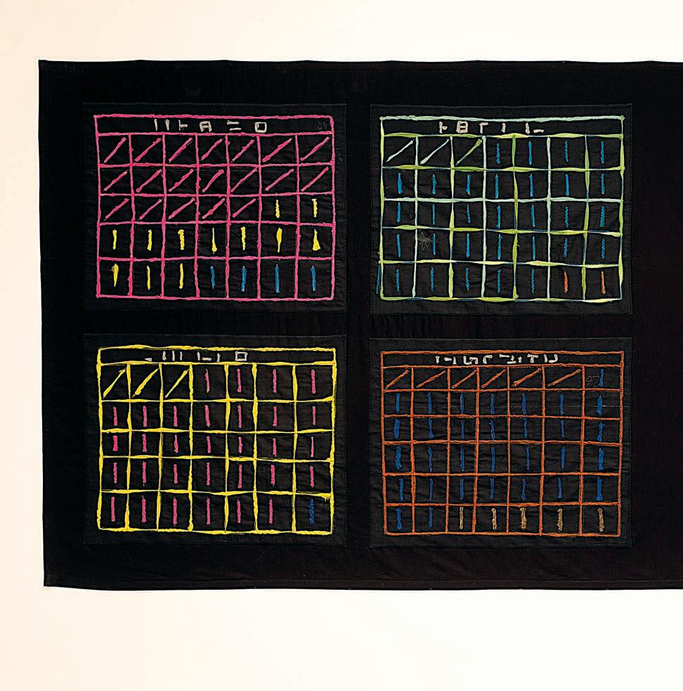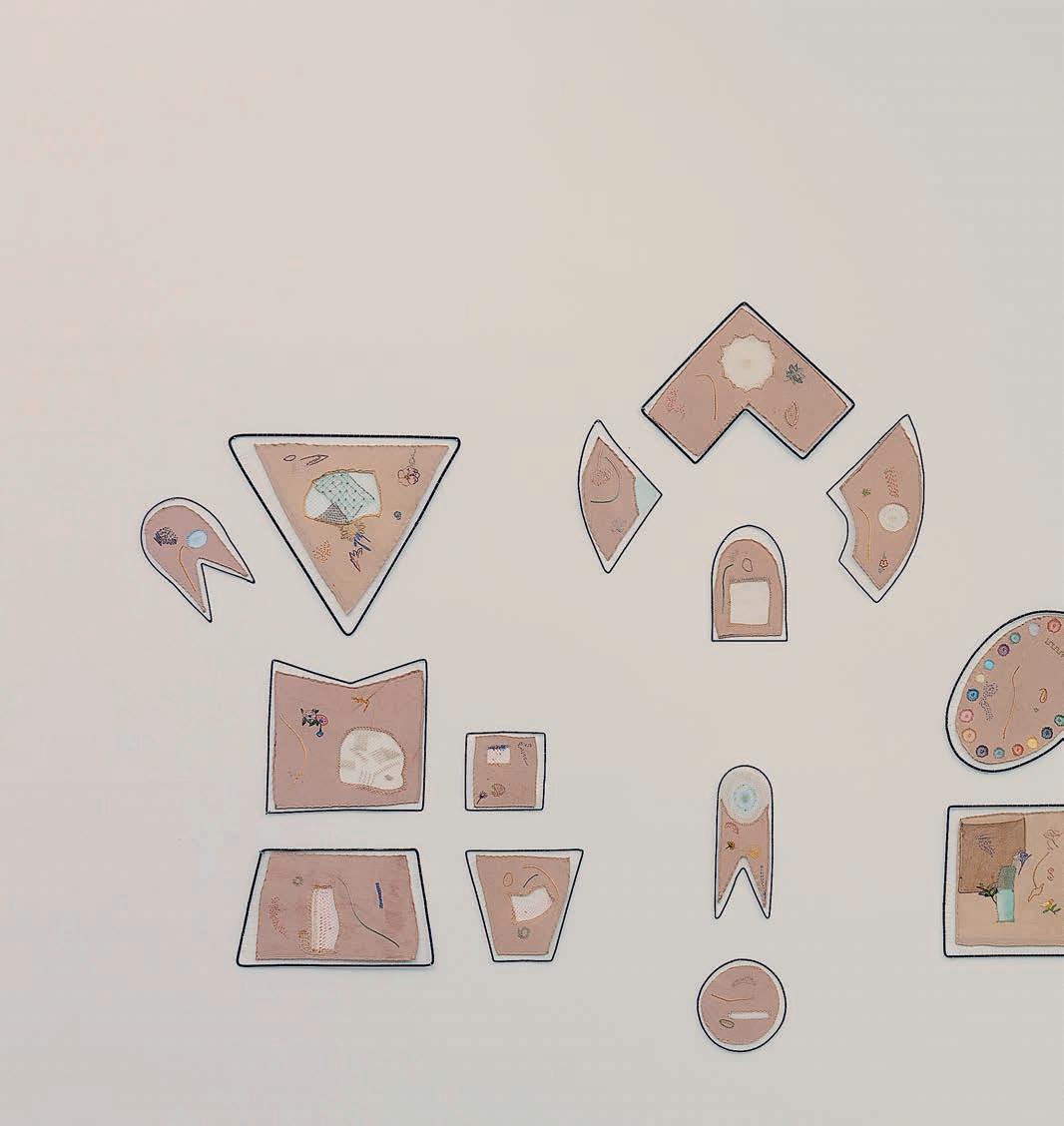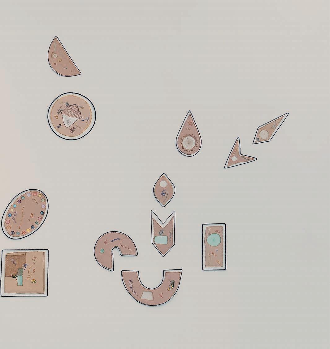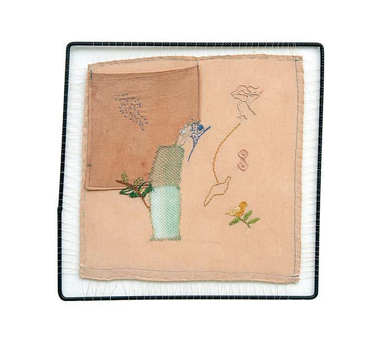 The work of Alejandra Mizrahi is inspired by craft methods of textile production in her region. She uses them to produce a range of fragments – cloths, weaves and lace – that make visible the infinite possibilities of these construction methods as well as the imprint of the individual and the place where they were produced: they contain information about the tension and regularities with which the body works, her trains of thought and imaginative outbursts and the resources she uses to colour the fabrics, which generally come from the fruits and vegetables she eats. The title, Fantasía aplicada evokes the decorative imaginative world we associate with embroidery but also seeks to reach a universe that might be a fantasy in itself, separate from the traditions that shape this kind of production. The artwork combines a geometry composed of a collection of frames made by Luis Pereyra – a supplier of frames for the community of weavers with whom Mizrahi is associated – that maintain some of the classic forms while also adding more whimsical designs, on which interiors of incredible intimacy and delicacy are embroidered. The fabric, dyed with avocado stones, is sewn, the artist says ‘to the cold, rigid outline of the shape,’ on which ‘flowers, bird silhouettes, lines that go nowhere and nets that catch the emptiness weave the fantasy together.’