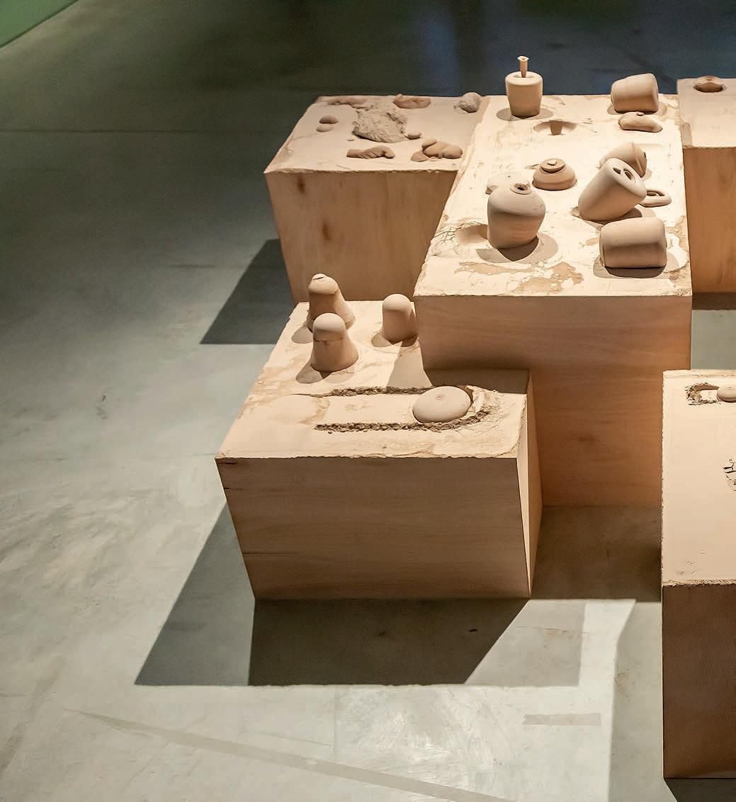 sculptures and installations reduce these objects to their basic forms, adopting formal minimalist strategies to distract from their functionality and create apparently classical and formal compositions that expose their original structure and richness. Sadir’s works in this exhibition, however, combine pure forms with representations of what arises from their link with the earth: the food she grows, the ceramics she makes, the objects of domestic and symbolic value that represent the materials she has access to in her local environment: from wood to guano and wicker. Set out over the earth she works with every day in her garden, these elements compose an essential order she presents as a gesture of gratitude and offering.