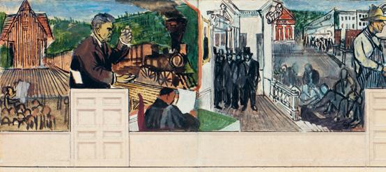 17. Shahn creó murales al fresco en la época del New Deal y más adelante murales en mosaico, además de vidrieras, esculturas y escenografías. En la década de 1930 hizo incluso una pequeña incursión en el cine que, según él, era “el medio maestro”.