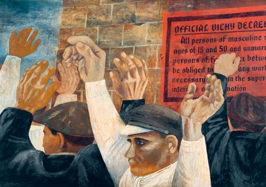 the rise of xenophobia and authoritarianism erupting around the world, including in longstanding democracies. Horowitz was invited to organize this show in the wake of the violent “Unite the Right” rally in 2017 that mobilized far-right extremist groups in protest of the proposed removal of the statue of Confederate General Robert E. Lee in Charlottesville, Virginia and in support of White supremacy.19 The curator situated Shahn’s work We Fight for a Free World! (c. 1942) (p. 152) at the heart of his installation. This painting was created to promote a never-realized series of anti-fascist posters Shahn envisioned for the Office of War Information (OWI) during World War II. It presents the proposed posters by artists of Japanese, Jewish, and German descent, featuring not the enemy but the “methods of the enemy”—a propaganda strategy intended to announce the dangers of Nazism to the U.S. population and strengthen domestic support for the war effort.