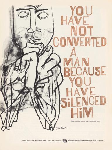 [William] Blake, in “Marriage of Heaven and Hell,” said that righteous indignation over injustice was the truest worship of God. And I guess I am filled with righteous indignation most of the time.... [M]y fear of absolutism, whether in religion, science, politics, or in art.... is the strongest fear I have. And then I feel I must make a statement. I feel that every direction has its right.... but the danger immediately becomes apparent when a particular direction is recognized as the only direction. Then I will raise my voice, as Blake said, at the injustice of this kind of absolutism.—Ben Shahn, 1966 1