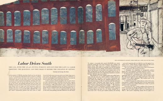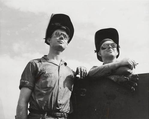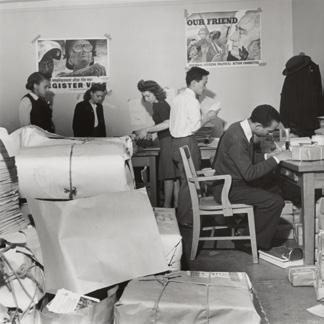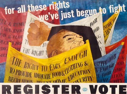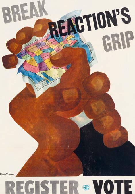 Besides working as a documentary photographer, Shahn also produced several murals, having learned fresco technique from Diego Rivera on the ill-fated Rockefeller Center mural project, which was destroyed after controversy erupted from its inclusion of a portrait of Vladimir Lenin. Shahn was commissioned by the U.S. Treasury’s Section of Fine Arts to make murals for the Bronx Central Post Office in New York and the original Social Security Building in Washington, D.C. He also worked for the Office of War Information (OWI) and the Congress of Industrial Organizations-Political Action Committee (CIO-PAC), producing a wide array of anti-Nazi propaganda posters for the former and graphics to help mobilize the working-class vote for the latter.