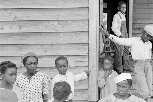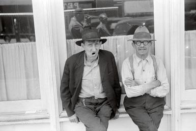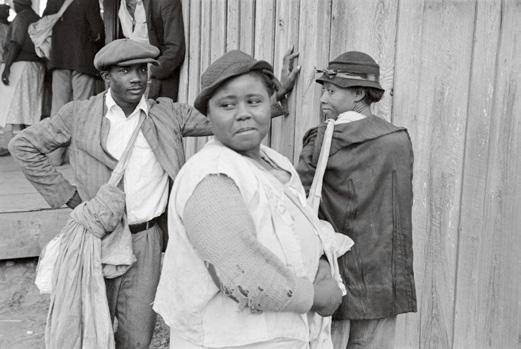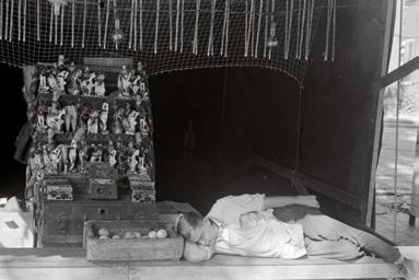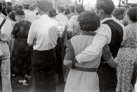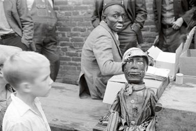 In fall 1935 Ben Shahn traveled to the Jim Crow South for the Resettlement Administration to photograph struggling rural workers. In Huntingdon, Tennessee, he recorded a traveling medicine show, a carnival-like event led by “quack” medicine men who entertained audiences to lure them into buying dubious miracle cures. Performers were often White men in “blackface” (minstrel show makeup now widely accepted as racist) or dressed as stereotyped Native Americans. Moving inconspicuously around the crowd, Shahn keenly observed racial dynamics from the edges of the scene and poignantly focused on one Black performer in blackface. (For many complex reasons, including limited opportunities, even Black entertainers engaged in the pervasive practice.) Staring enigmatically at the photographer, the Black man exists in triangular tension with a White boy mesmerized by a Black puppet. With such layered visual complexities, Shahn’s series compels reflection, reading more as an empathic critique than a blatant exposé of a most demeaning form of racial exploitation.