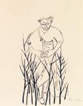 The exhibition shows how Shahn attempted to stay true to his own vision but also remain relevant. Even as his harshest critics denigrated his art as mere propaganda, as “illustration” or “journalism” (and hence, not “high art”), his postwar work was in demand with private collectors and major museums and appreciated by noted critics as well as by particular sectors of the public in the U.S. and Europe. (Abstract expressionism was not “codified” until the later 1950s.) Shahn won accolades, such as the Charles Eliot Norton Professorship at Harvard University in 1956 and honorary degrees in the 1960s. He continued to make meaningful art in the midst of attacks from right-wing politicians and publications like Counterattack, as well as interrogation by the Federal Bureau of Investigation (FBI) and the House Un-American Activities Committee. What remains fascinating, as Frances Pohl has so cogently detailed, is how Shahn was able to appeal artistically to the pro-labor left and the business-oriented or moderate right.7 Equally intriguing is how Shahn engaged with artists far from his own aesthetic ideology, such as conceptual composer John Cage, abstract expressionists Robert Motherwell and Barnett Newman, and the younger abstractionist Cy Twombly, the latter of whom Shahn mentored. This happened despite his protestations against abstract and non-objective art as noncommittal and divorced from human values and his mocking comments on pop art, happenings, and minimalism.8 Conversely, Dada-inspired pop artists like Andy Warhol, in his early commercial work, emulated Shahn’s trademark “blotted line.” Pop art has even been linked to the populist folk and graphic design of Shahn’s generation.9 (Shahn admired the whimsically irreverent abstraction of Paul Klee and Alexander Calder as much as the trenchant realism of Francisco de Goya and Honoré Daumier.)