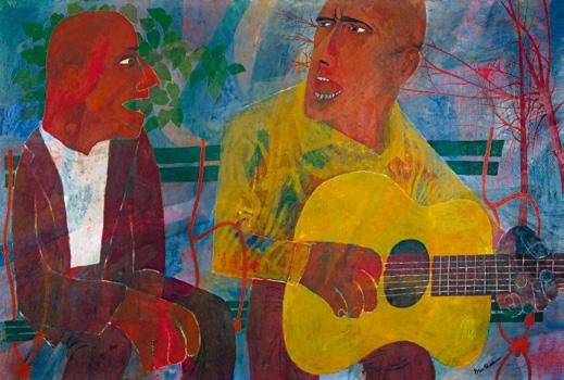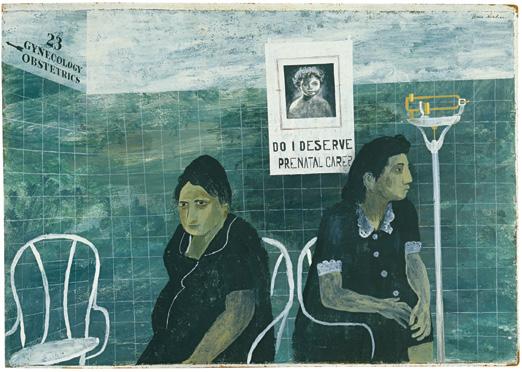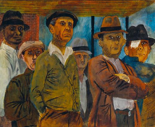Like Smith, Gopnik highlighted a classic Shahn work that shows his success at depicting people with identities different from his own. Willis Avenue Bridge exemplifies Shahn’s “Sunday Paintings” series, which reflects his shift from an “art for the masses” to one that features the daily rituals of ordinary individuals—often waiting—as well as the artist’s keen observations about their human and material conditions. This image of two Black women sitting on a bench that seems to float before a bridge connecting Manhattan to the Bronx over the Harlem River was created from Shahn’s own New York photographs. While the transparent tempera layers evoke pathos and highlight the bony ankles of the elderly woman’s thin body, the alarming red girders of the bridge and sturdy crutches of the disabled woman anchor the picture. The older woman’s proud bearing, stylish cape, and elegant pearl necklace exude dignity.