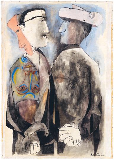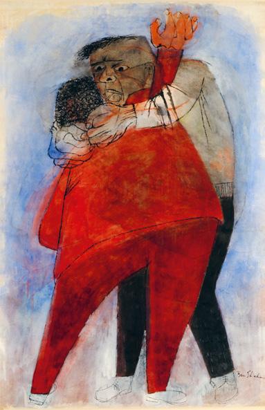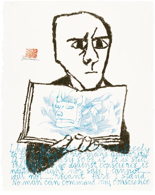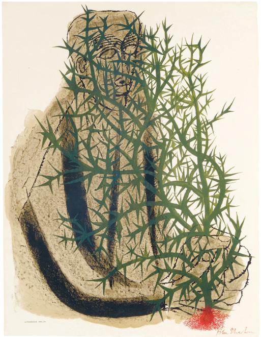 work, not even when, toward the end of his career, he began to focus on themes linked to Judaism, spirituality, and religious history. Katzman underlines one of Shahn’s most singular virtues: he always managed to find a way to remain true to his personal vision. Even in the harshest moments of McCarthyism, which coincided with the first boom of abstract expressionism, a form of art that seemed the polar opposite of Shahn’s political and aesthetical ideals, he was still favored by a significant sector of critics, museum institutions, and the general public. Indeed, he was selected, alongside the abstract painter Willem de Kooning, to represent the United States at the 1954 Venice Biennale and was awarded the Charles Eliot Norton Professorship at Harvard University in 1956.