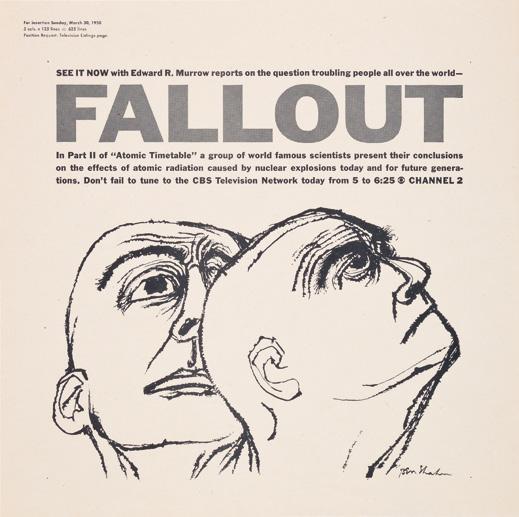 The artist’s embrace of accessible and reproducible media coincided with his wide patronage—federal, state, and city governments; labor unions; corporations; political campaigns; religious organizations; universities and other nonprofits; and private art collectors. With each agency or project, Shahn surged to the forefront as a leader with farreaching vision. A force of inexhaustible energy and drive, the warm, gregarious artist cut a charming figure as a raconteur in his prime and was remembered at the end of his life as “a generous, affectionate, wise and humorous giant of a man.”18 Even as he faced ideological clashes, dismissals, censorship, and blacklisting, Shahn never lost his conviction that art should be integral to society as a moral tempering force for science. Believing that the poet was as essential as the physicist, he praised attempts to revive the humanities in the early atomic age. Such beliefs resonate today, given the divestment in the arts and humanities by governments and educational institutions and the intense focus on science, technology, engineering, and math to prepare younger generations for the high-tech global economies of our time.