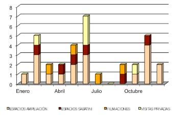 Esto supone fomentar los contactos con responsables de instituciones culturales para discutir posibles proyectos. Además se reciben habitualmente visitas de responsables de distintos museos, de coleccionistas, artistas, herederos, etc. En ese apartado es destacable la colaboración establecida en 2012 con el Instituto Aragonés de Arte Contemporáneo Pablo Serrano, en cuya sede se ha depositado una obra de la Colección, y las reuniones celebradas con diversas instituciones extranjeras para valorar posibles exposiciones itinerantes de la Colección del Museo Reina Sofía –por ejemplo de una selección de obras de cine y vídeo–, algunas de las cuales se llevarán a cabo en 2013.