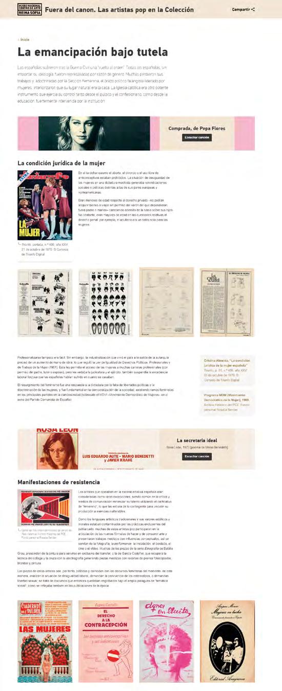 sociales y los canales de streaming del Museo se convirtieron en la plataforma de en cuentro entre la institución y sus públicos, que se vieron ampliados gracias al medio digital, especialmente en América Latina. Se presentaron nuevos microsites, una herra mienta muy atenta a la experiencia del usuario, en torno a obras y periodos de la Colec ción, como Fuera del canon. Las artistas pop en la Colección, centrado en la repercusión del movimiento feminista en la obra de autoras españolas de las décadas de 1960 y 1970; se organizaron conferencias como la impartida por la filósofa Judith Butler en el marco de la Cátedra Políticas y estéticas de la memoria, del Centro de Estudios, que logró un récord de asistencia; la primera edición del ciclo audiovisual Tiempos inciertos I. Cine durante la cuarentena, destinado a analizar las consecuencias sanitarias, sociales y eco lógicas de la pandemia y su gestión, o varias sesiones del programa Voces situadas, como la duodécima ¿Quién cuida a la cuidadora? Capitalismo, reproducción y cuaren tena, dedicada a visibilizar la labor y realidad de las mujeres cuidadoras y migrantes. Además, se experimentó por primera vez con el formato de exposición online con va rias muestras que abordaron la experiencia del confinamiento como Artistas en cuaren tena, organizada por la confederación de museos L’Internationale, Con tres heridas yo o Clemente Bernad. Ante el umbral; y se desarrollaron iniciativas concebidas específica mente para las redes sociales como el proyecto de mediación #GiraEnTuCasa del Área de Educación.