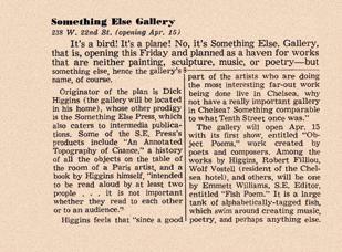 develop the Press, an aesthetic and intellectual, commercial, and social system for the arts? What were his motivations? Second: What was the historically urgent role he discerned for the artist/artwork in that moment that could be best channeled through a sophisticated, perhaps unprecedented publishing initiative? Finally, what can be made of the total output of the Something Else Press, across which Higgins developed a diffuse artistic statement? To address these questions, I will examine the historical context of the Something Else Press, highlight some of its strategies, and discuss some of the books. The effort, here and in the exhibition, to illuminate the rich, informed, and eclectic output of the Something Else Press seeks to restore its position not just in its moment but in the history of postwar art.