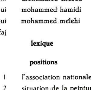 38. Mohamed Sijelmassi, La Peinture marocaine, París, Arthaud, 1972. 39. Latifa Serghini es autora de varias biografías, entre ellas las de Ahmed Ben Driss el Yacoubi (2015), Mohamed Hamri (2017) y Jilali Gharbaoui (2019). 40. Crítico de arte y comisario de la exposición en el Encuentro Internacional de Artistas celebrado en Rabat en 1963. 41. Esposa del artista Mohamed Melehi y colaboradora de la revista Souffles .